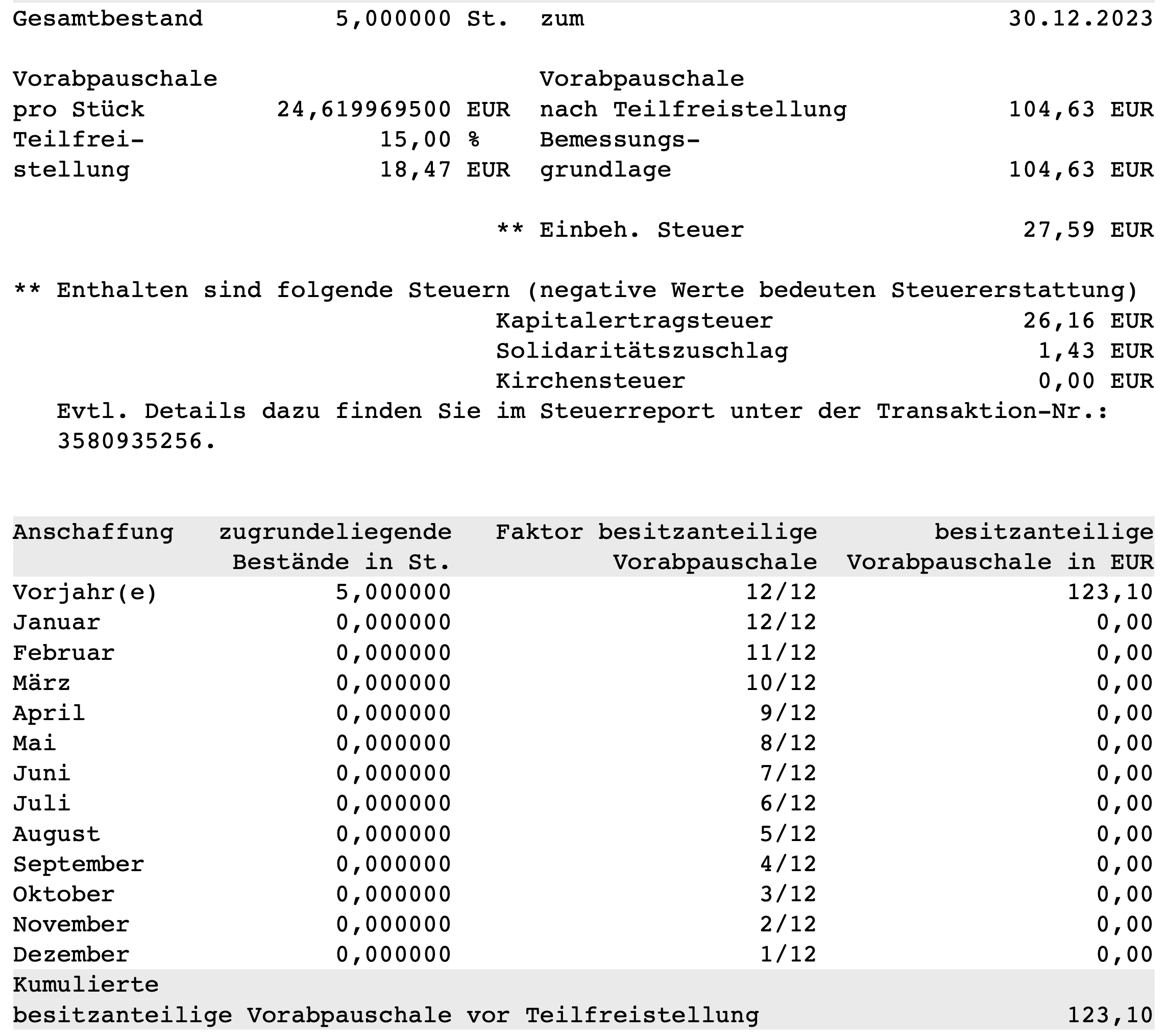 Ramstein Januar 26, 2024 · bearbeitet Januar 26, 2024 von Ramstein Jetzt wurde die erste Vorabpauschale bei Flatex gebucht. In der Abrechnung fehlt nur der Jahresanfangskurs. Sehr positiv: Valuta der Buchung ist auch heute. Etwas irritierend: das Abrechnungsdokument hat die Bezeichnung xxxx_VerkaufFondsZertifikate_yyy. In den Kontoumsätzen ist aber korrekt "Vorabpauschale ISIN" genannt. Nachtrag: Und in den "Details zur Depotposition" wird die Vorabpauschale ausgewiesen. Diesen Beitrag teilen Link zum Beitrag