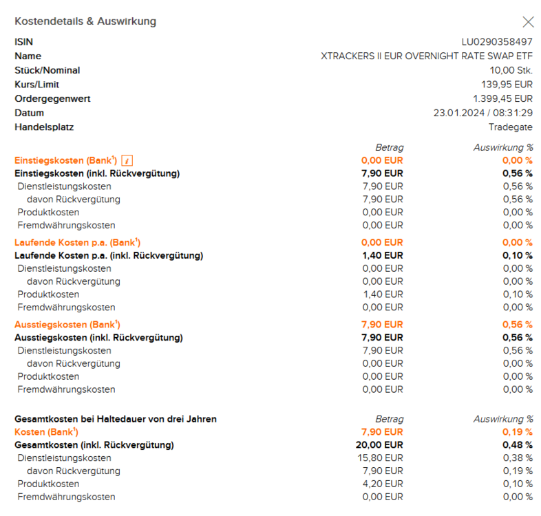 DennyK Januar 23, 2024 · bearbeitet Januar 23, 2024 von DennyK Du hast in der falschen Kategorie geschaut. Schau doch auf die Kostendetails, da steht auch noch mal das du 0€ zahlst und es 7,90€ Rückvergütung gibt. Anscheinend liest du die Kostendetails falsch. Das wichtige sind die orangefarbenen Kosten und da steht bei Einstieg eben 0,00€. Und zu deiner Frage zu den Kosten vom Entnahmeplan. Im PLV steht kostenlos. Selbst wenn sie also Kosten verlangen kann man diese sicherlich mit Verweis auf das PLV erstattet bekommen. Wenn natürlich erst gar keine Kosten, wie im PLV genannt, anfallen wäre es noch besser. Darum ging es auch in meiner Frage. Zufrieden? Diesen Beitrag teilen Link zum Beitrag