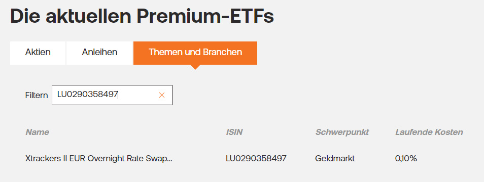 odensee Januar 23, 2024 vor 1 Stunde von DennyK: Einkauf ab 1000€ ist glaub ich bei den Xtrackers EUR Overnight Rate Swap Acc im Einmalkauf kostenlos. Woher hast du diese Information? Zu den Premium-ETF gehört er nicht: und mir werden beim Einzelkauf Kosten angezeigt. Zumindest bei Tradegate Diesen Beitrag teilen Link zum Beitrag