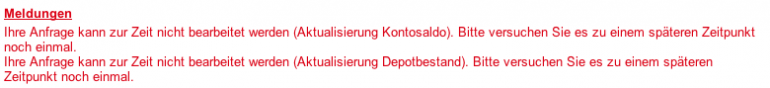 Tony Soprano September 12, 2011 Kann mich seit einer ca. einer halben Stunde nicht mehr bei Flatex anmelden. "Ihre Anfrage kann z.Zt. nicht bearbeitet werden (Anmeldung). Bitte versuchen Sie es zu einem späteren Zeitpunkt noch einmal. Ordereinstellungen sind in der Zwischenzeit weiterhin möglich." Habe ich Infos zu Wartungsarbeiten übersehen oder ist Flatex mal wieder überlastet? hatte ich auch, geht aber wieder. gehandelt aber ich aber nicht Diesen Beitrag teilen Link zum Beitrag