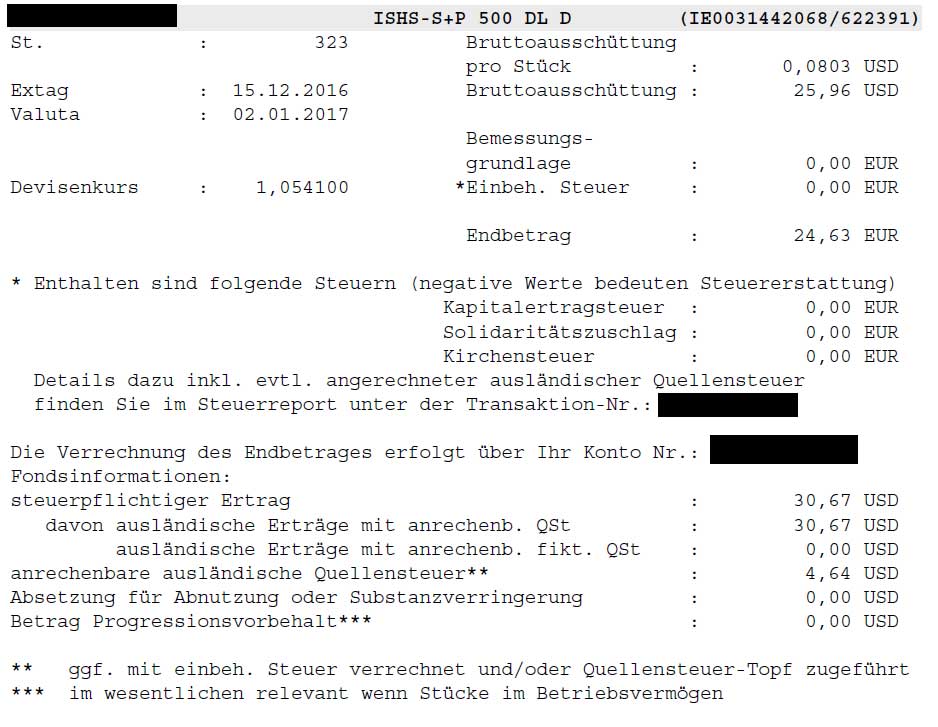 vesh März 5, 2017 Ich habe mal nochmal eine andere Frage, wo die ganze Flatex Geschichte gerade so ausgetreten wird. Und zwar bezüglich den Kosten für die Ausschüttung ausländischer Dividenden. Im Preisleistungsverzeichnis steht ja eindeutig: Kapitaltransaktionen (z.B. Aktiensplit, Stockdividende, Spin-offs) Inland: kostenfrei Ausland: Provision je Transaktion: kostenfrei Provision je Ertragsausschüttung (Fonds und ETF): kostenfreiProvision je Dividendenzahlung: 1,50 EUR (Gegenwert kleiner 15 EUR)Provision je Dividendenzahlung: 5,00 EUR (Gegenwert größer 15 EUR) Nun frage ich mich aber, wie das genau funktioniert. Ich bespare mehrere ETF bei Flatex. Darunter auch der iShares S&P 500 (IE0031442068), welcher ein physischer Replizierer und Ausschütter ist und damit nur amerikanische Einzelwerte hält. Das Fondsdomizil ist außerdem Irland. D.h. sowohl die Wertpapiere im Fonds als auch der Fonds selbst sind im Ausland. Was wäre hier denn prinzipiell entscheidend? Fondsdomizil oder? Nun habe ich beispielsweise im Dezember eine Dividende erhalten (Extag 15.12.2016). Auf meinem Auszug (siehe Anhang) von Flatex steht aber nichts von Kosten drauf. Dividende war über 15€. Dennoch kann ich hier nirgendwo die Kosten in Höhe von 5€ sehen. Verstehe ich etwas falsch oder wird das irgendwo untergemogelt wo ich es gar nicht sehe? Vom Verrechnungskonto wurde auch nichts dafür abgebucht und die Kosten tauchen in meinen Augen nirgendwo auf, habe überall geschaut. Gilt das nur für Einzelaktien und nicht für ETFs oder was verstehe ich falsch? Danke für jeden Hinweis :-) Diesen Beitrag teilen Link zum Beitrag