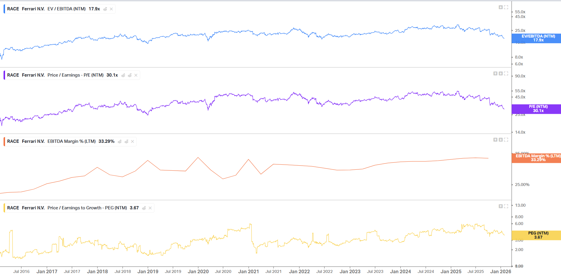 Apollo13 vor 4 Stunden Historisch sieht die Bewertung derzeit wirklich attraktiv aus, die Frage ist wie viel ist man bereit zu zahlen, für ein Unternehmen das zwar im Luxus Sektor auf einer Ebene mit Hermes ist, und für Automotive sehr gut Margen hat. Dennoch ist durch die begrenzte Produktion der zukünftige Earnings Surprise auch irgendwie eingepreist. Da Ferrari nur gewisse Stück produziert und die so gut wie ausverkauft sind weiß ich also im vorhinein in etwa wie viel Umsatz / Gewinn erwirtschaftet werden kann ?! Trotz der Marke, für mich immer noch zu teuer wenn man Analystenschätzungen von +8% Umsatzwachstum für 26/27 und +7% EPS 26/27 trauen kann. Diesen Beitrag teilen Link zum Beitrag