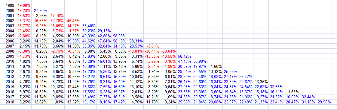 Ich bin seit 2000 meist komplett voll investiert, Dividenden wurden meist wieder angelegt, keine weiteren Geldzuflüsse.