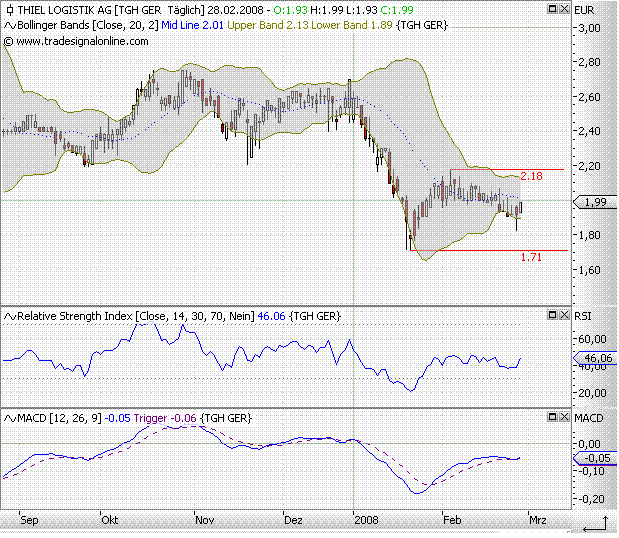 Mitch Februar 28, 2008 Ich bin hier heute mit einer spekulativen Position zu 1,95 eingestiegen. Die Gründe: 1) Spekulation auf einem positiven Kursverlauf mit Hinblick auf die Veröffentlichung des Geschäfsberichtes 2007 am 11.03.08. 2) Anfang des Jahres kam die Meldung, dass Stefan Quandt seine Beteiligung ausgebaut hat ---> Mehrheitsaktionär erhöht Anteil 3) Im Chart gestern ein "Hammer": und heute entgegen dem Markttrend ein guter Tageschart mit Schluss auf Tageshoch 1,99 . Diesen Beitrag teilen Link zum Beitrag