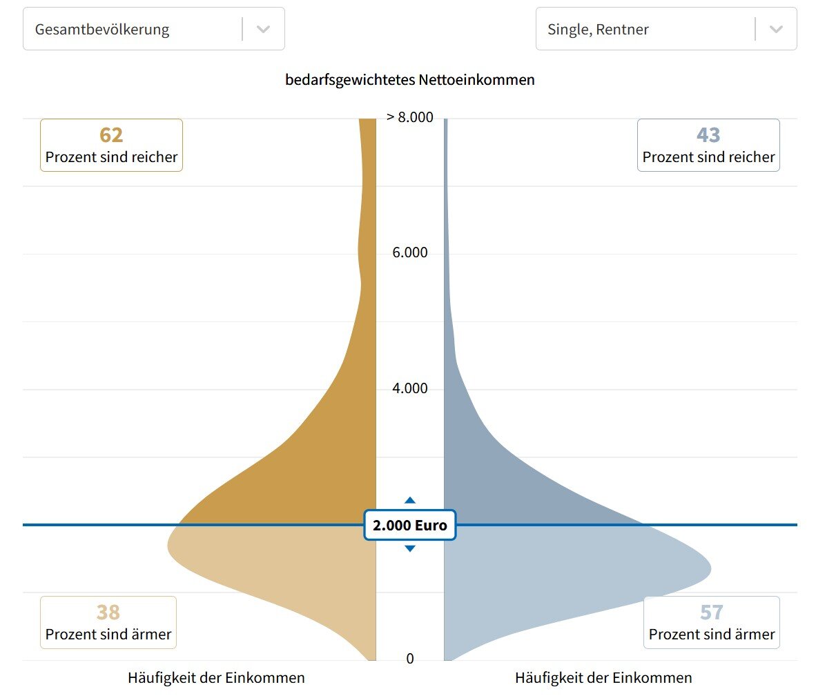 Cepha 13. September · bearbeitet 13. September von Cepha vor 40 Minuten von Der Heini: Sind wir hier nicht in einer Bubble und sehen nur die Multi-Millionäre? Ja, natürlich. Hier in dem Rechner sind meines Wissens beim Nettoäquivalenzeinkommen alle Einkommen, alle Transferzahlungen und auch der Mietwert einer selbst genutzten Immobilie mit drin. Als Beispiel mal 2000€ netto für einen 1 Personen Haushalt. Das ist ein in Deutschland völlig normales verfügbares Monatsnettoeinkommen. Die arbeitende Bevölkerung soll davon dann eigentlich noch 10-15% für die private Altersvorsorge zurück legen. Nimmt man also besser 2300€, dann hat man sogar genau den Median der Gesamtbevölkerung getroffen. Das ist nicht "Hartz IV ähnlich" oder "frugal", das ist normal. Diese Leute dürften nur hier im Forum selten auftreten bzw. schreiben, schon garnicht in FIRE threads mit Millionendepots. Quelle: https://www.iwkoeln.de/fileadmin/user_upload/HTML/2025/Einkommensrechner/index.html Diesen Beitrag teilen Link zum Beitrag