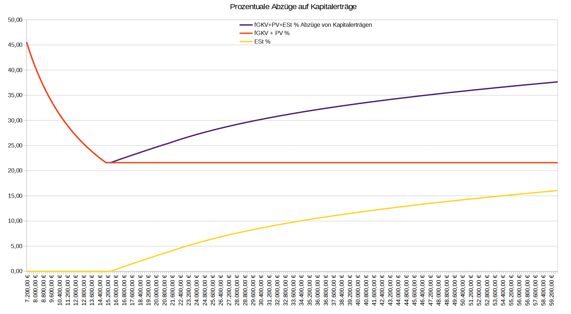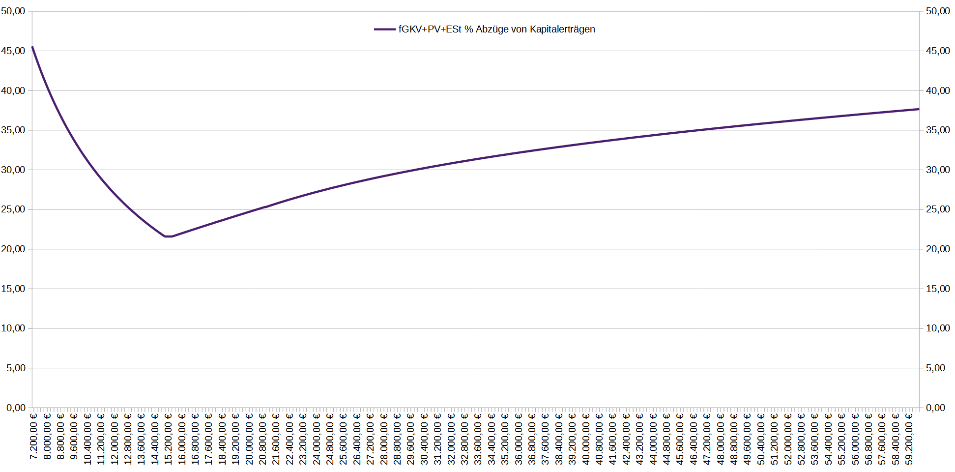 Das ist für mich der Versuch abschätzen zu können, wie sich die prozentualen Abzüge auf Kapitalerträge entwickeln, abhängig von deren Größe, wenn man freiwillig gesetzlich Krankenversichert ist und bei der Steuer die günstiger Prüfung in Anspruch nimmt.