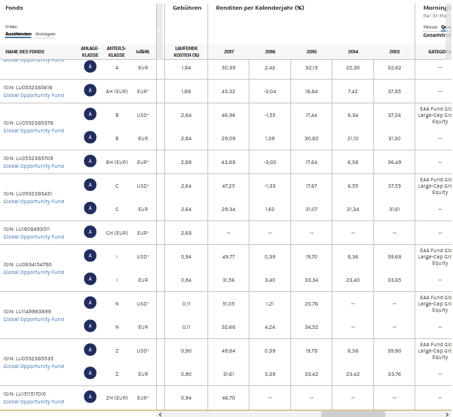 roadsterthomas Juli 13, 2018 Am 11.7.2018 um 21:53 schrieb Arasu: "Über den Fondsfinder von Stiftung Warentest / Finanztest habe ich den Morgan Stanley Global Opportunity Fund entdeckt, der mir ganz gut erscheint:..." Ich hatte mich vor einiger Zeit mit dem Fond beschäftigt. Ich meine mich zu erinnern, das die Wertentwicklung des Fonds beinahe identisch mit dem "MSCI World Information Technology Index" war, weswegen ich mir dann gedacht hatte ich könnte dann auch gleich in den World IT ETF investieren, da sind Gebühren und Risiken geringer. Danke für den Tipp, werde ich mir zumindest mal anschauen! Am 12.7.2018 um 09:18 schrieb Framal: I geht nur, wenn Du mind. 500.000 US$ (siehe Bild unten) anlegst. Wenn nicht, bleiben für Dich die Anlageklasse A oder AH. Danke für die Info und den Screenshot! Trotz Sucherei konnte ich diese Information vorher nicht finden. Diesen Beitrag teilen Link zum Beitrag