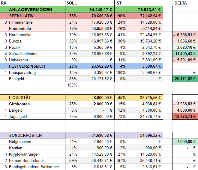 PuddleScratcher August 14, 2018 · bearbeitet August 14, 2018 von PuddleScratcher 2 hours ago, west263 said: Da solltest Du eigentlich deine Energie und Zeit in die neue Asset Allokation stecken. Ist in Arbeit, hier meine aktuelle Überlegung: Dazu ein paar Kommentare: "Firmenanteile" sind Aktien meines Arbeitgebers (ohne Haltefrist), die ich aktuell nicht verkaufen will Der Bausparvertrag wirft noch 1,5% + 1,0% Bonuszinsen ab, daher bespare ich ihn in der aktuellen Niedrigzinsphase weiter bis zum Maximum Fürs Festgeld werde ich eine Festgeldleiter bei Credite Agricole anlegen. Zunächst je 7000 € für 6 Monate, 2 Jahre und 3 Jahre. Beim Ablauf des 6-monatigen Festgelds dann Verlängerung einmalig um weitere 6 Monate. Anschließend alle Anlagen für 3 Jahre. Ist meine Liquiditätsreserve vernünftig angesetzt? Im nächsten Jahr stehen eine Hochzeit und zwei größere Urlaube an, die ich damit stemmen kann. Sollte es wider Erwartens nicht reichen stehen der Notgroschen und das schnell frei werdende Festgeld bereit. Den Anteil an Kryptowährungen sehe ich als Spielgeld und halte ihn daher aus der Berechnung heraus. Insbesondere da die "Anschaffungskosten" schon seit langem abgegolten sind. "Firmen-Sonderfonds" ist ein vielleicht etwas ungewöhnlicher Fonds für Mitarbeiter meines Unternehmens, der auf Aktien der Firma basiert. Man konnte einmalig eine begrenzte Anlage für 5 Jahre tätigen, eine Rendite von mehr als ~90% ist dabei garantiert und in Abhängigkeit der Kursentwicklung ist auch mehr drin. Als große Frage bliebe noch, welche ETFs ich jetzt besparen möchte. Dazu stünden bis zu 1500 € monatlich zur Verfügung. Am naheliegendsten fände ich vier Fonds (z.B. auf MSCI World, MSCI Europe, MSCI EM und MSCI Pacific) um auf eine 30/30/30/10 Aufteilung zu kommen. Dann könnte ich meinen Lyxor MSCI World und Lycor MSCI Europe eventuell behalten und weiter besparen. Ausschüttende Fonds brauche ich ja ohnehin um den Pauschbetrag zukünftig auszureizen. Und dann vielleicht thesaurierende EM und Pacific ETFs dazu? Das Depot würde ich bei der Onvista Bank anlegen um beim Rebalancing gegenüber der DKB Kosten zu sparen. Klingt das plausibel? Auf Anregungen bin ich gespannt. Diesen Beitrag teilen Link zum Beitrag