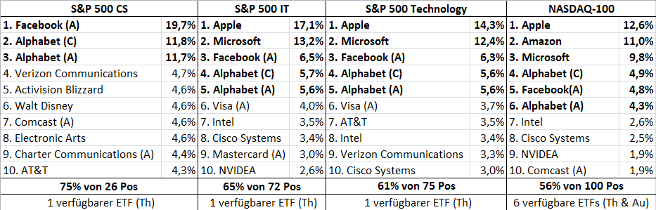 DST September 5, 2018 · bearbeitet September 5, 2018 von DST Zitat State Street Global Advisors hat die Einführung des SPDR S&P U.S. Communication Services Select Sector UCITS ETFs bekannt gegeben [...] Der neue Sektor Kommunikationsdienstleistungen umfasst drei der fünf FAANG-Aktien – Facebook, Netflix und Googles Muttergesellschaft Alphabet [...], Telekommunikationsunternehmen wie Verizon und AT&T sowie Medien- und Unterhaltungsunternehmen wie Comcast und Netflix. Sie spiegeln das aktualisierte Ökosystem der heutigen Kommunikation und des Zugangs zu Unterhaltung wider. Quelle: https://www.extra-funds.de/news/etf-news/spdr-neuer-etf-wird-in-neue-sp-500-struktur-gegossen/ Index: https://us.spindices.com/indices/equity/sp-communication-services-select-sector-daily-capped-25-20-index/?geographicalRegion=europe&complianceLevel=esma&cvmlanguage=1&_ga=2.224647194.1011058573.1536102878-1723126093.1536102878 ETF: https://www.ssga.com/products-capabilities/products/fund.ZPDK GY.PC1954.FG48.ZPDK.html?fundUmbrella=SPDR® ETFs Europe&fundISIN=IE00BFWFPX50®ion=eu&location=de&role=financial-advisors&language=en&fileExists=true Nachtrag: Ich habe noch einen weiteren ETF ausfindig machen können, der allgemein in Technologie (IT & CS) investiert und nach der Indexumstellung dem derzeitigen S&P 500 IT noch am ehesten entsprechen müsste. Ich habe diesen Ansatz meinem vorherigen Post beigefügt. Das sind die 10 größten Positionen der vier diskutierten Indizes im Vergleich Die derzeit größten und stärksten Technologie-Aktien (FAANG und Microsoft) sind fett markiert Th = Thesaurierer | Au = Ausschütter Diesen Beitrag teilen Link zum Beitrag