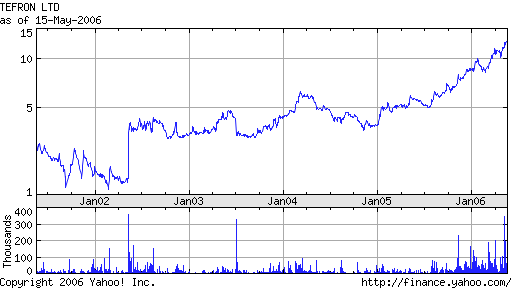 Nussdorf Mai 16, 2006 WKN : 909298 ISIN : IL0010825854 Branche : Bekleidungsartikel Land : Israel, höchste Umsätze : NYSE About Tefron : Tefron manufactures boutique-quality everyday seamless intimate apparel, active wear and swim wear sold throughout the world by such name-brand marketers as Victoria's Secret, Nike, The Gap, Banana Republic, Target, Warnaco/Calvin Klein, Patagonia, Reebok and El Corte Englese, as well as other well known retailers and designer labels. The company's product line includes knitted briefs, bras, tank tops, boxers, leggings, crop, T-shirts, nightwear, bodysuits, swim wear, beach wear and active-wear. The Company's Healthcare Division manufactures and sells a range of textile healthcare products. Was die Aktie für mich wirklich interessant macht, ist erstens der sehr erfreuende Kursverlauf, und außerdem die Zahlen. Im ersten Quartal 2006 war ein Gewinn von 0.26$ pro Aktie, was ein KGV von 12 ergibt, trotz der starken Kursgewinne, diese sind gerechtfertigt ! Zudem finde ich die Homepage extrem ansprechend, zudem ist Tefron sehr innotiv!! The Tefron Research and Development team continually pushes the possibilities. Our relentless pursuit to create the best look, feel, and fit, keeps us on the cutting edge - constantly one step ahead of the competition. The First seamless bra. The First soft-waistband panty. The First ultrasonic seam. Our track record confirms our fierce commitment to innovation. Nahtlose Kleidung ! Quellen : www.Tefron.com Das EBITDA hat sich im ersten Quartal verdoppelt ! EBITDA for the quarter was $10.5 million compared with $5.6 million in the same period in 2005. Falls sich jemand noch mehr informieren empfehle ich entweder: Google Finance Die Homepage Finance Yahoo Was ich zudem interessant finde, dass die Aktie trotz der Konsolidiertungen munter weiter gestiegen ist ! Klar, die Aktie wird hoffentlich bald ein wenig konsolidieren, aber trotzdem finde ich sie sehr interessant. Andere große Bekleidungshersteller (auch wenn es natürlich keine identen betätigungsfelder gibt) haben ein deutlich höheres KGV! (Das KGV ist natürlich nicht alles !) Zum Beispiel : Bijou 26, Hugo Boss 19, Ralph Lauren 23. Tefron ist im hinteren Bereich was das KGV angeht ! Ich freue mich auf eure Meinungen, ihr könnt auch schreiben falls euch meine Vorstellung nicht gefallen kann, oder was ich verbessern kann (ich weiß diese ist etwas sensationell geschrieben, ich werde shcon wie Risiko :w00t: ) Hier noch der 5 Jahres Chart: Diesen Beitrag teilen Link zum Beitrag
