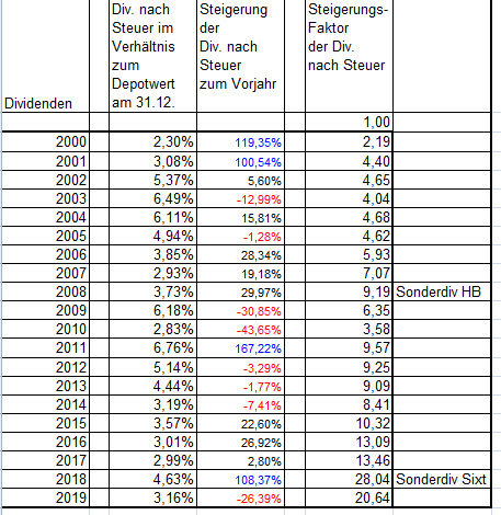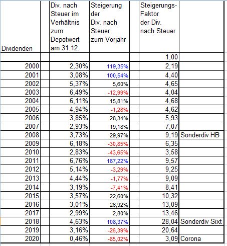 dev September 4, 2018 · bearbeitet April 2, 2019 von dev Ich investiere seit 96 in Aktien, zockte dann einige Jahre mit Optionsscheinen und habe mich durch das Buch Buffettology, zu einem langfristig denkenen Anleger entwickelt. Da ich mich immer wieder erklären muß, z.B. https://www.wertpapier-forum.de/topic/53925-klumpenrisiko/?page=10#comment-1162319 hier mein Thread, wird sicher sehr unübersichtlich werden ;-) --- Mein Ziel bzw. Idee: Wenn sich Sixt so weiter entwickelt, wie in den vergangenen 30 Jahren ( längere Zahlen habe ich nicht), dann könnte ich eventuell in ca. 15 Jahren und nach Inflation so viel Dividenden erhalten, das uns diese locker das Auskommen im Alter sichern wird. Alle anderen Werte und die investierten Dividenden bis dahin, wären ein Puffer falls es nicht so sein sollte. Der Aktienkurs von gestern, heute oder morgen - ist in dieser Spekulation nicht enthalten! D.h. der Anteilverkauf den andere favorisieren, ist zusätzlich möglich. P.S. Seit 1999 wurde die Einlage nur geringfügig erhöht, aber 2007-2010 wurden Gewinne dauerhaft abgezogen ( ca. 2/3 der Einlage ) So haben sich meine Dividenden entwickelt: Und das ist mein Renditedreieck nach Steuer: Diesen Beitrag teilen Link zum Beitrag