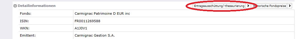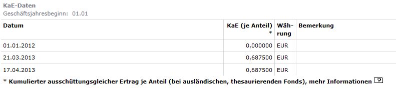 ceekay74 April 28, 2013 Be ebase wurde auch abgerechnet und die Ausschüttung am 22.4. wiederangelegt. Schneller als gedacht, ist die Ausschüttung mittlerweile mit Valuta 29.04. (sogar von ebase korrekt versteuert) auf meinem Konto bei der ING-DiBa angekommen. Bei ebase finden sich noch keine steuerlichen Daten zu dem Fonds, kommt vermutlich noch. Es finden sich vielmehr immer noch die oben genannten falschen, also Obacht bei Rückgabe... Edit: Ich schiebe hier gleich nochmal eine Frage für die ebase Nutzer nach. Mein Ebase Depot ist noch nicht so alt und dies ist meine zweite Ausschüttung dort. Ich habe bei beiden Vorgängen nur eine Mitteilung (Umsatzabrechnung) über die Wiederanlage erhalten. Von der DAB bin ich gewohnt in solchen Fällen auch noch Dokumente über den Thesaurierungs- und Ausschüttungsvorgang zu erhalten mit genauen steuerlichen Daten. Übersehe ich da etwas? In meinem Fall habe ich natürlich durch das noch junge Depot einen recht großen Verlusttopf (aufgelaufene Zwischengewinne). Dort sehe ich natürlich auch, dass die Steuern der Ausschüttungen und Teilthesaurierungen abgerechnet wurden, allerdings nur über alle Fonds hinweg. Liegt das eventuell an der Verrechnung mit dem Verlusttopf oder handhabt das ebase generell so, dass man sich die Sachen selber zusammensucht? Irgendwie fehlt mir da halt was greifbareres zu den Vorgängen. Ohje, soviel wollte ich gar nicht editieren und das ganze ist offtopic, woanders besser aufgehoben...., sorry. Die doch etwas versteckten Angaben zur Ausschüttung befinden sich hinter diesem Türchen in der Depotübersicht: (Auf das "Plus" der entsprechenden Depotposition links in der Depotübersicht klicken) Diesen Beitrag teilen Link zum Beitrag
