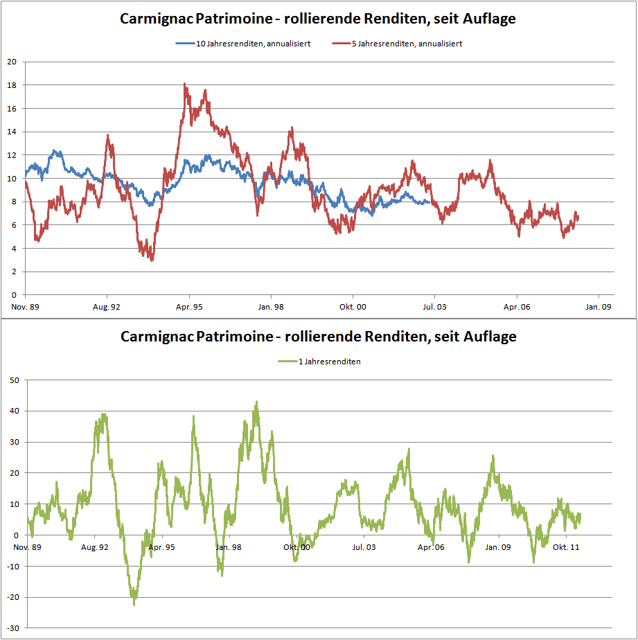 Chemstudent Mai 2, 2013 Da ich einmal dabei war: Rollierende 1, 5 sowie 10 Jahresrenditen des Patrimoine. Die Werte habe ich annualisiert für eine bessere Vergleichbarkeit. 1 Jahresrenditen aus Übersichtsgründen separat. Diesen Beitrag teilen Link zum Beitrag