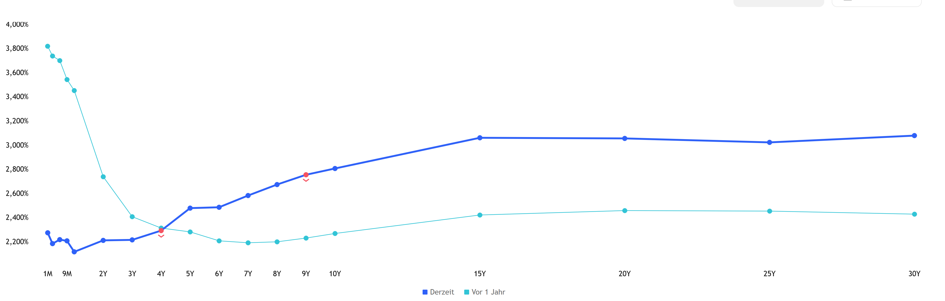 hier sieht man anhand der deutschen Staatsanleihen schön, dass es nicht so einfach ist/war. Die kurzfristigen Zinsen gingen runter, aber die langfristigen Zinsen stiegen: