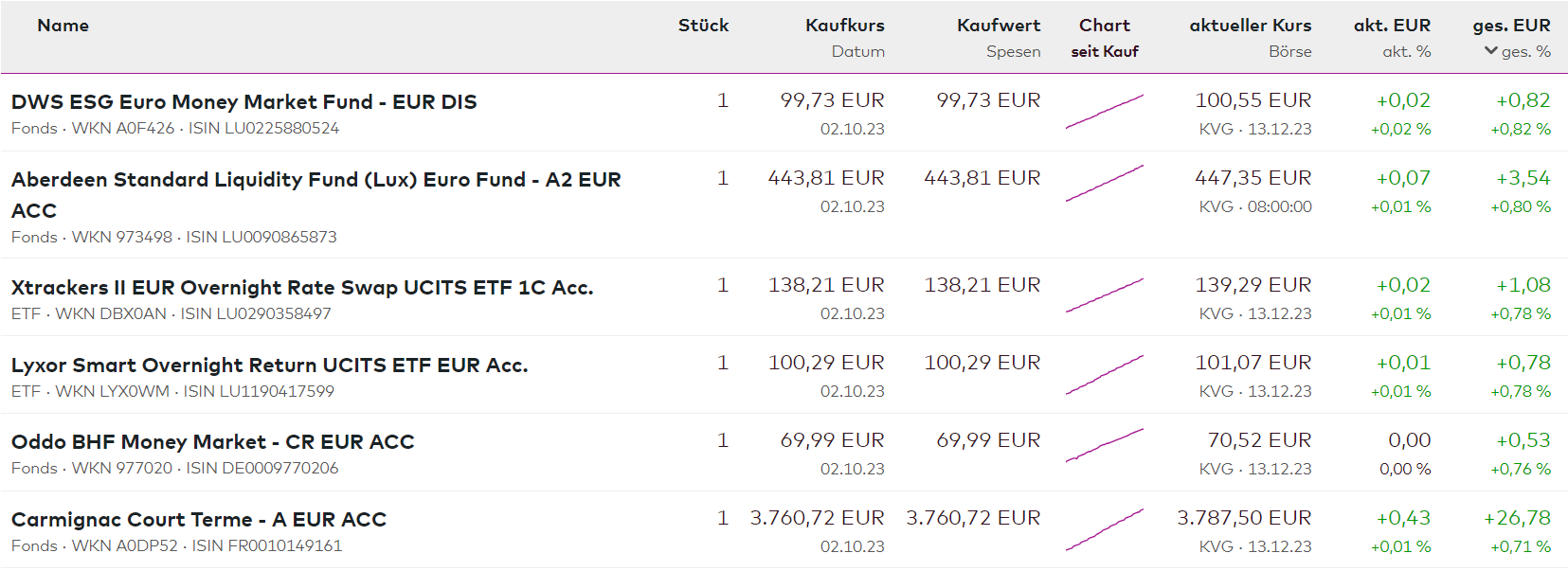 Die TER innerhalb relativ kurzer Zeit so häufig anzupassen finde ich nicht so sympathisch. Letztes Jahr war die TER bei 0,08%. Auch die Laufzeit der Anleihen ist nicht ganz so kurz wie bei richtigen Geldmarktfonds.