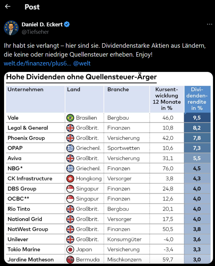 hattifnatt April 7, 2025 vor 15 Stunden von Maestro315: Derzeit bzw bald bieten sich wohl gute Gelegenheiten um recht gute Titel mit hohen yields aufzupicken. Habt ihr schon Dividendentitel nachgekauft bzw. Eine potentielle Watchlist falls die Korrektur so weiter geht? Hier sollte man fündig werden (die meisten Artikel sind Premium, aber der vom Februar nicht): https://aktienfinder.net/blog/dividenden-aktien-mit-rabatt-februar-2025/ Diesen Beitrag teilen Link zum Beitrag