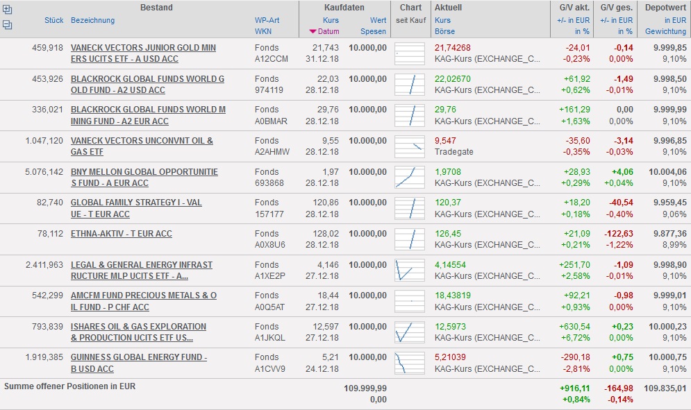 Ich lerne dazu Januar 4, 2019 Hier meine "vorläufige" Aufstellung. Kann sein, dass ich bis 14.01. noch Änderungen vornehme. Die Kurse habe ich von Depotstar/infos soweit die Fonds dort gelistet sind, ansonsten von finanzen.net. Es sind alles KAG-Kurse. Bezüglich der defensiven Rentenfonds bitte ich mal zu prüfen, ob die so okay sind. Diesen Beitrag teilen Link zum Beitrag