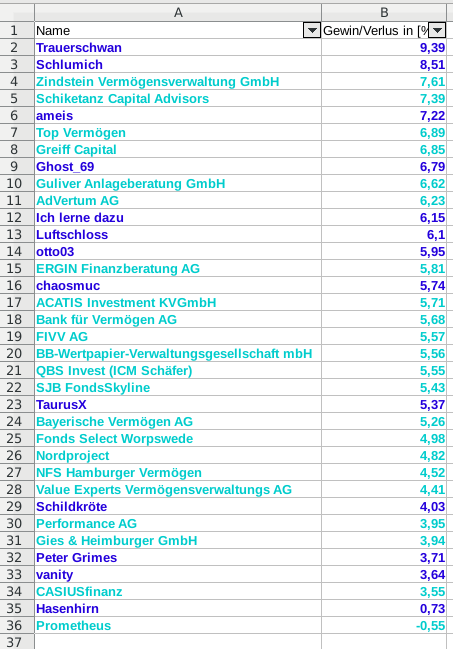ghost_69 Februar 4, 2019 vor 13 Stunden schrieb chaosmuc: ich werde sicher nicht jeden Monat Zeit finden, die Auswertung zu machen. Daher folgender Vorschlag: Wir sind 13 Mitspieler, ghost_69 hat den Thread bereitgestellt, jeder andere Mitspieler darf in einem Monat die Auswertung machen. Was haltet Ihr davon? Die Werte der Profis finden sich unter: https://www.acatis-research.de/portal/DepotListeDMEuro.ap Vielen lieben Dank, das hört sich gut an und im laufe des Jahres übernehme ich sicherlich auch eine. Ghost_69 Diesen Beitrag teilen Link zum Beitrag