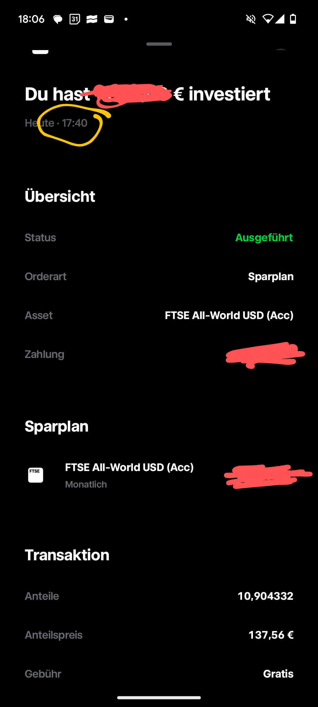 Update: Du kannst beruhigt sein. Gegen 17:40 wurde nichts für den Kurs ausgeführt, dein Sparplan wurde wie immer zu beobachten zwischen 16:30 und 17:00 Uhr ausgeführt. Müsste in einer der folgenden Transaktionen sein (das sind zusammen die TR Sparplanausführungen für den A2PKXG):