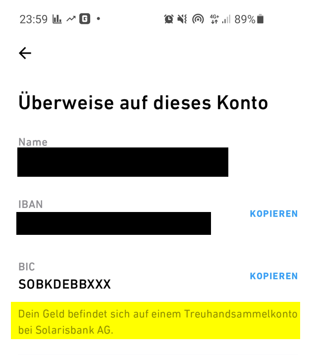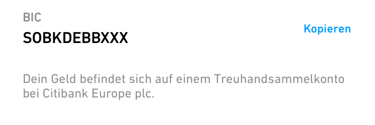 Nach der Einzahlung eines größeren Geldbetrages steht dort unter der Solarisbank-IBAN dieser Text in kleiner grauer Schrift: „Dein Geld befindet sich auf einem Treuhandsammelkonto der Citibank Europe plc.“