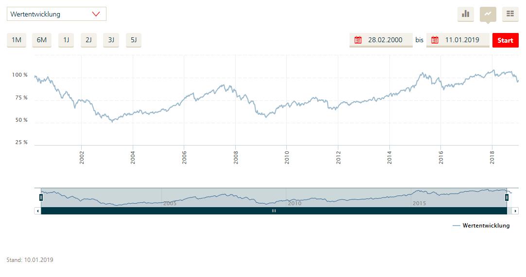 Hätten sie damals in einen preiswerten MSCI World Fonds investiert mit reinvestierten Ausschüttungen, stände dort heute ein Plus von ca. 109%, immerhin eine Rendite von ca. 4% pro Jahr. Bei 2% Kosten für den Dachfonds + ggf. nochmal 2% für die enthalten Fonds + ggf. Depotgebühren bleibt nach 19 Jahren leider nichts mehr übrig vom Gewinn.