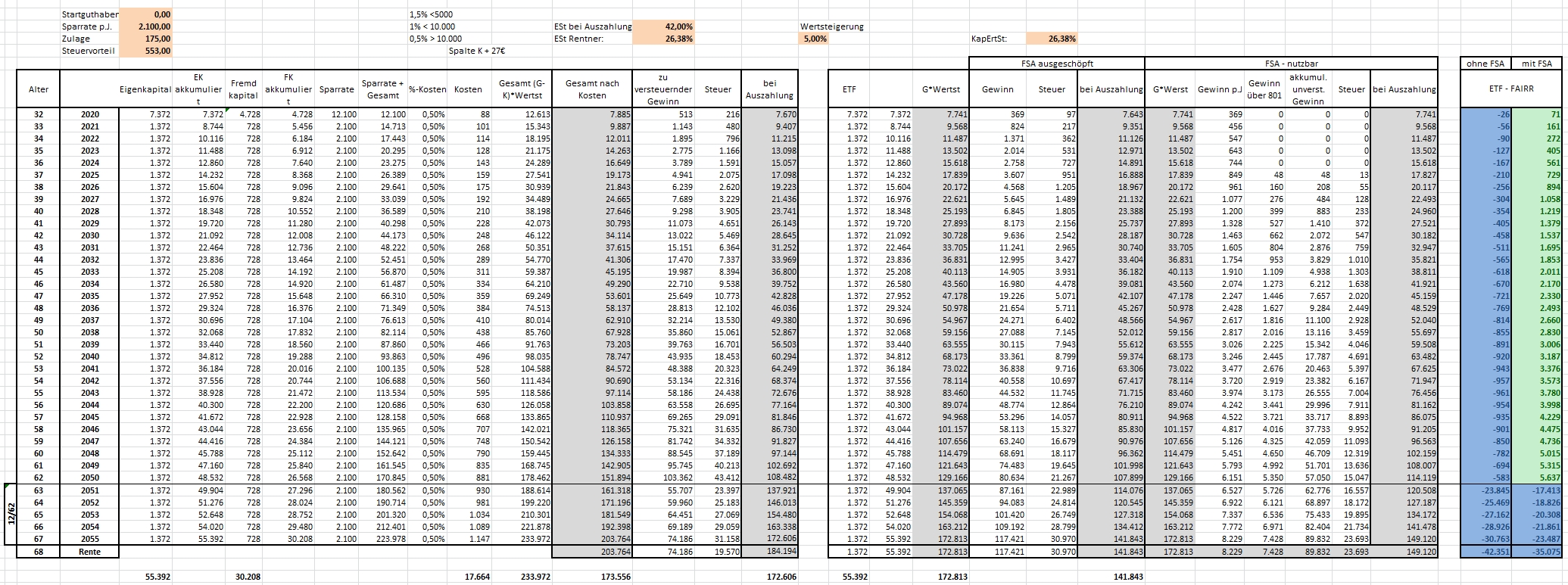Lauchsuppe Februar 22, 2019 vor 1 Stunde schrieb DenominationPax: Ich kann aber die 10.000 nicht in einen normalen ETF stecken, weil die 10.000 aus einem bestehenden Bankenriester kommen, aber ich verstehe was du meinst. Ich zahle zwar anteilig weniger Gebühren, aber absolut ja viel mehr, weil meine 10.000 € Einlage auch noch mit den Gebühren belastet werden. Ah, ja das ist doch ne gute Info. vor 1 Stunde schrieb DenominationPax: Mein jetziger Riester beinhaltet ja eigentlich schon zu ca. 40% Fremdkapital. Dann müsste es ja eigentlich doch vorteilhaft sein. Habs mal in die Tabelle gesteckt. Fairr Einzahlung 6000 EK + 4000 FK bei dem ersten Sparjahr hinzugefügt gegenüber ETFs Starteinzahlung + 6.000€ (Annahme förderschädliche Kündigung). Hier mal mit 5% Wertsteigerung. So richtig viel setzt sich dein Guthaben mit ETFs und FSA ausnutzen nicht von der Fairrvariante ab. Und wenn du die ganze Geschichte hältst bist du 62J bist (& 12J Haltedauer), dann gibt´s schon einen netten Bonus. Ab 8% Wertsteigerung ist das Fairr-konstrukt dann sogar bereits nach 20Jahren im Vorteil. Ab einer kleineren Wertentwicklung als 2,5% ist die ETF-Variante mit Ausnutzen des FSA eigentlich im gesamten Zeitraum vorne (außer Auszahlung zur Rente)... vor 1 Stunde schrieb DenominationPax: Das heißt, wenn du ich wärst, würdest du den Bankenriester förderschädlich kündigen und die Riesterbeiträge ab jetzt in einen normalen ETF Sparplan investieren? Kommt ganz auf deine Anlageziele & Situation an. Man sieht, dass sich die ganze Geschichte eigentlich nur lohnt, wenn dein FSA bereits ausgenutzt ist (linke Spalte). Die gesamte Geschichte lohnt sich eigentlich erst so richtig, wenn man das Geld so lange anlegt bis die 12/62 - Regelung greift, wo die Beträge so hoch sind, dass auch der FSA nicht mehr viel ändert. Bei dem ganzen Vorhaben geht einem mit der erkauften Mehrrendite natürlich Flexibilität verloren. Ich werde hier nichts empfehlen, weil ich nicht weiß inwieweit die Excel systematische Fehler oder anderes enthält.... Am besten spielst du die ganze Sache einfach mal mit deinen Daten in der Excel durch und guckst für deinen speziellen Fall! Diesen Beitrag teilen Link zum Beitrag