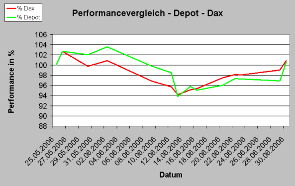 Teletrabbi Juni 15, 2006 Nochmal nen Update. Diesmal mit allen Positionen und ne Excel-Tabelle für die Performance Entwicklung im Vergleich zum Dax (habe natürlich nur unregelmäßige Zwischenstände). Update: nach Nordex-Verkauf (11,04) ergibt sich ein neuer Barmittel-Bestand: 2570,66 EUR Diesen Beitrag teilen Link zum Beitrag