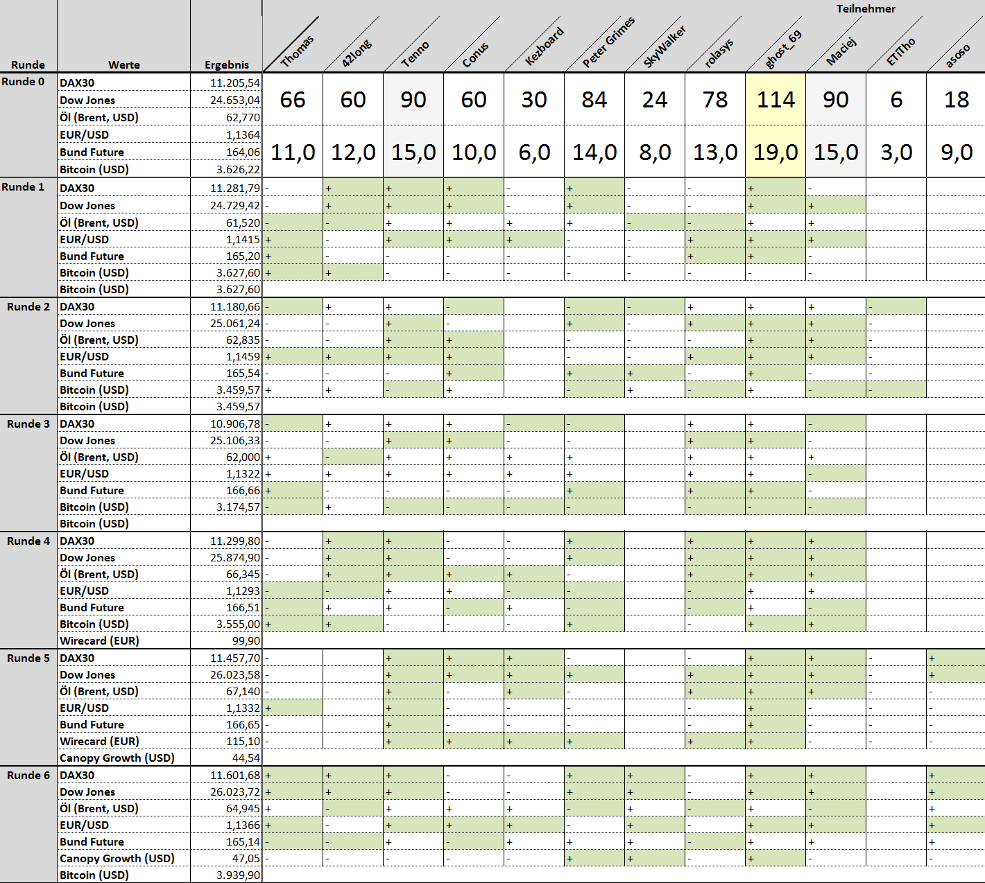 Thomas März 1, 2019 Hallo zusammen, eine weitere Börsenwettrunde beginnt. Viel Spaß beim Wetten. Tippabgabe bis Montag 17:00 Uhr --> 7. Runde von 11 Runden. Neue Startwerte und Veränderung aus der letzten Runde: 1. DAX30: 11601,68 (+) 2. Dow Jones: 26023,72 (+) 3. Öl (Brent, USD): 64,945 (-) 4. EUR/USD: 1,1366 (+) 5. Bund Future: 165,14 (-) 6. Canopy Growth (USD): 47,05 (+) 6. (Neu) Bitcoin (USD): 3939,9 Informationen: Erst Tippabgabe! Danach können weitere Beiträge verfasst werden. Anders herum wird disqualifiziert! Die ersten 5 Werte stehen während der ganzen Tippsaison fest. Der 6. Wert wechselt von Runde zu Runde. Vorschläge für einen 6. Wert werden jederzeit entgegengenommen. Es dürfen jederzeit auch neue Spieler einsteigen und sich am laufenden Spiel beteiligen. Regeln: https://www.wertpapier-forum.de/topic/368-regeln-und-informationen-für-die-börsenwette/ Fragen: https://www.wertpapier-forum.de/topic/1420-fragen-zur-börsenwette-hier-rein/ Bitte die Tipps im vorgegebenen Format abgeben! So sieht der richtige Code als Beispiel aus: [hide ] (hier das Leerzeichen noch entfernen vor "]") 1. + 2. - 3. - 4. + 5. + 6. - [/hide] Mein Tipp: Versteckter Inhalt Du kannst den versteckten Inhalt sehen, sobald du auf dieses Thema antwortest. Diesen Beitrag teilen Link zum Beitrag