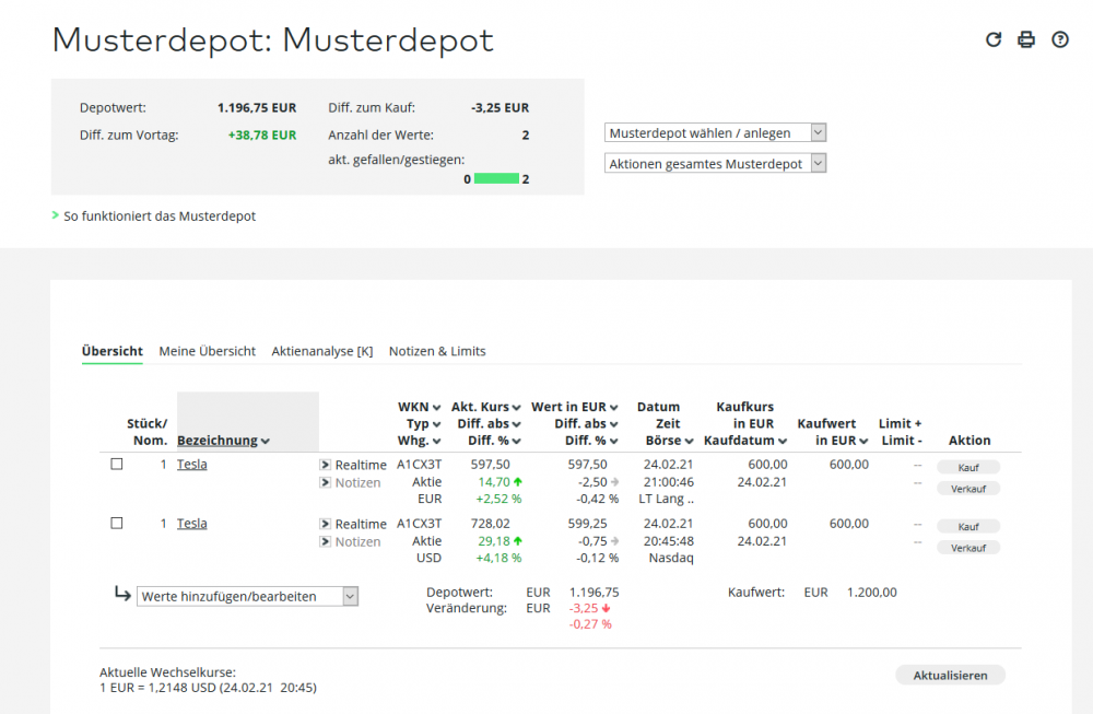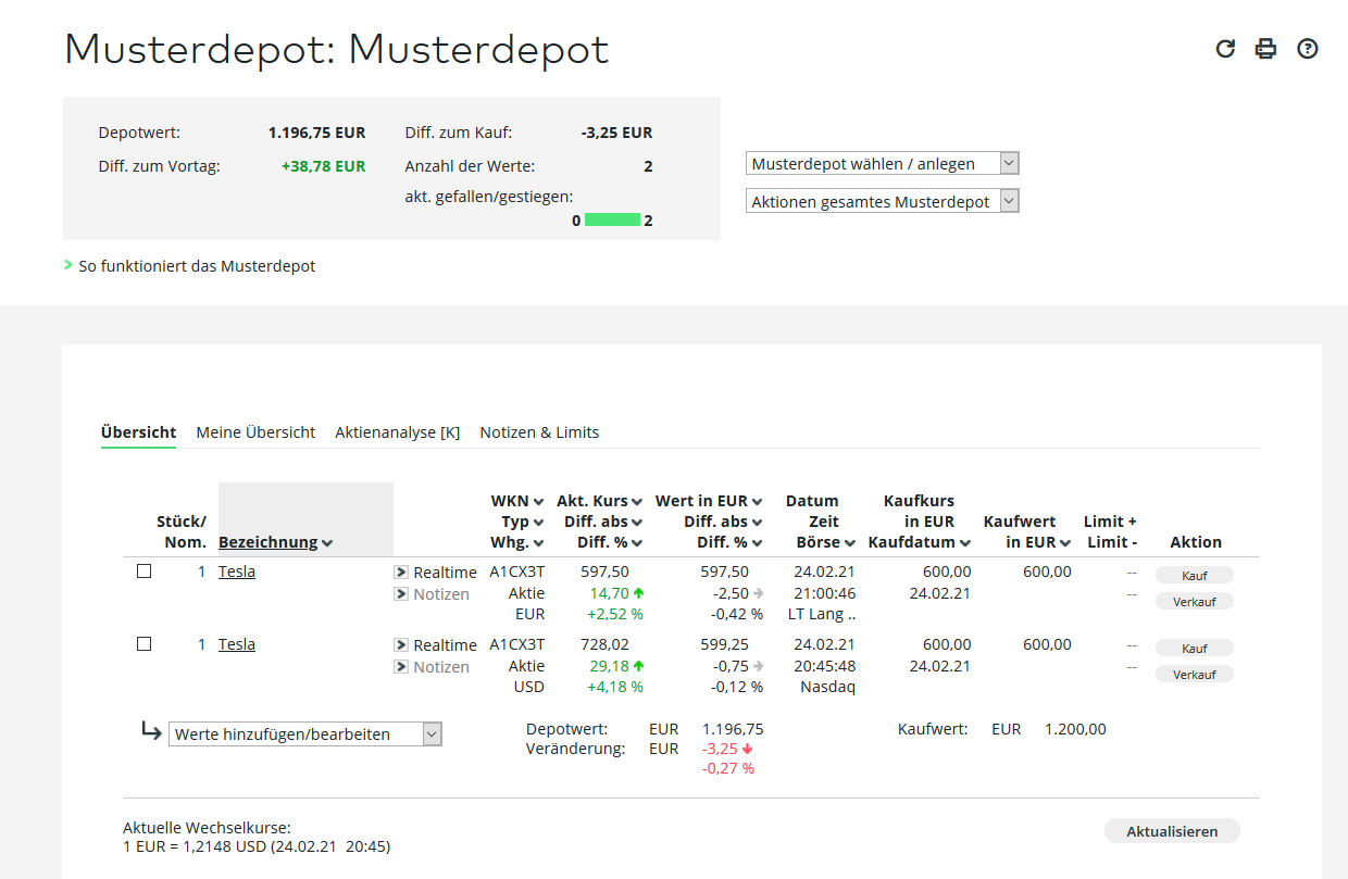 650überNN Februar 24, 2021 Hallo zuammen, habe mir gerade ein Musterdepot mit je einer Tesla-Aktie angelegt um mir auf die schnelle mal, auch von unterwegs, die aktuelle Kursentwicklung anzusehen und um einen besseren Überblick des handelsgeschehens diesseits und jenseits des Atlantiks zu haben. Nur so als Tipp, für diejenigen, für die so etwas auch in Frage kommen könnte. Grüße 650überNN Diesen Beitrag teilen Link zum Beitrag