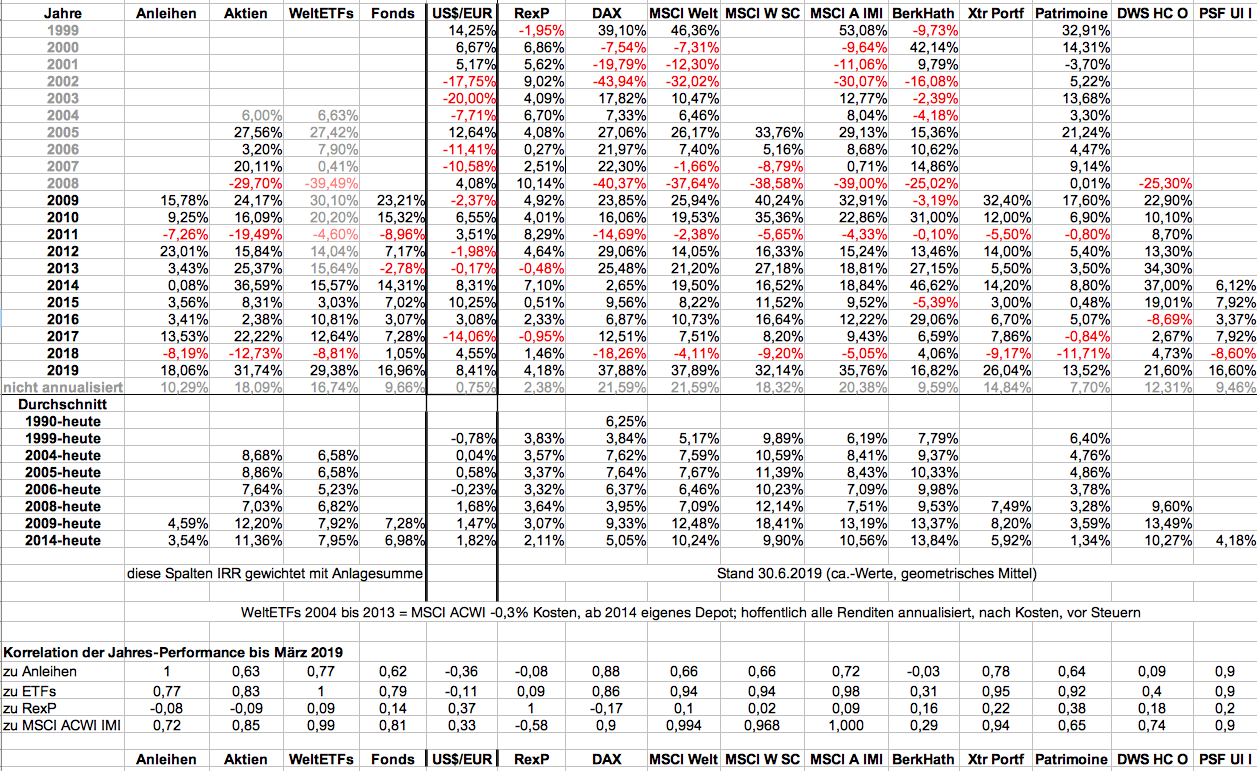 Daher führe ich meine eigenen Performancetabelle mit den jährlichen Werten und einigen Zeitraums-Betrachtungen. Auch die Korrelation der Performance meiner(!) Assetklassen betrachte ich, ebenso einige Referenzwerte. Auf dieser Basis treffe ich dann guten Gewissens meine eigenen Entscheidungen und verlasse mich nicht blind darauf, was Wesire, Rocker, Zocker, etc. sagen.
