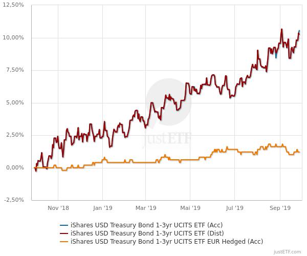 Siehe Mal den ishares Treasurry 1-3 Jahre einmal in USD und gehded in Euro. In einem Jahr hat der USD 10% mehr Rendite bei ansonsten gleichem Fond.