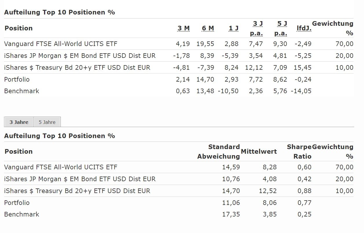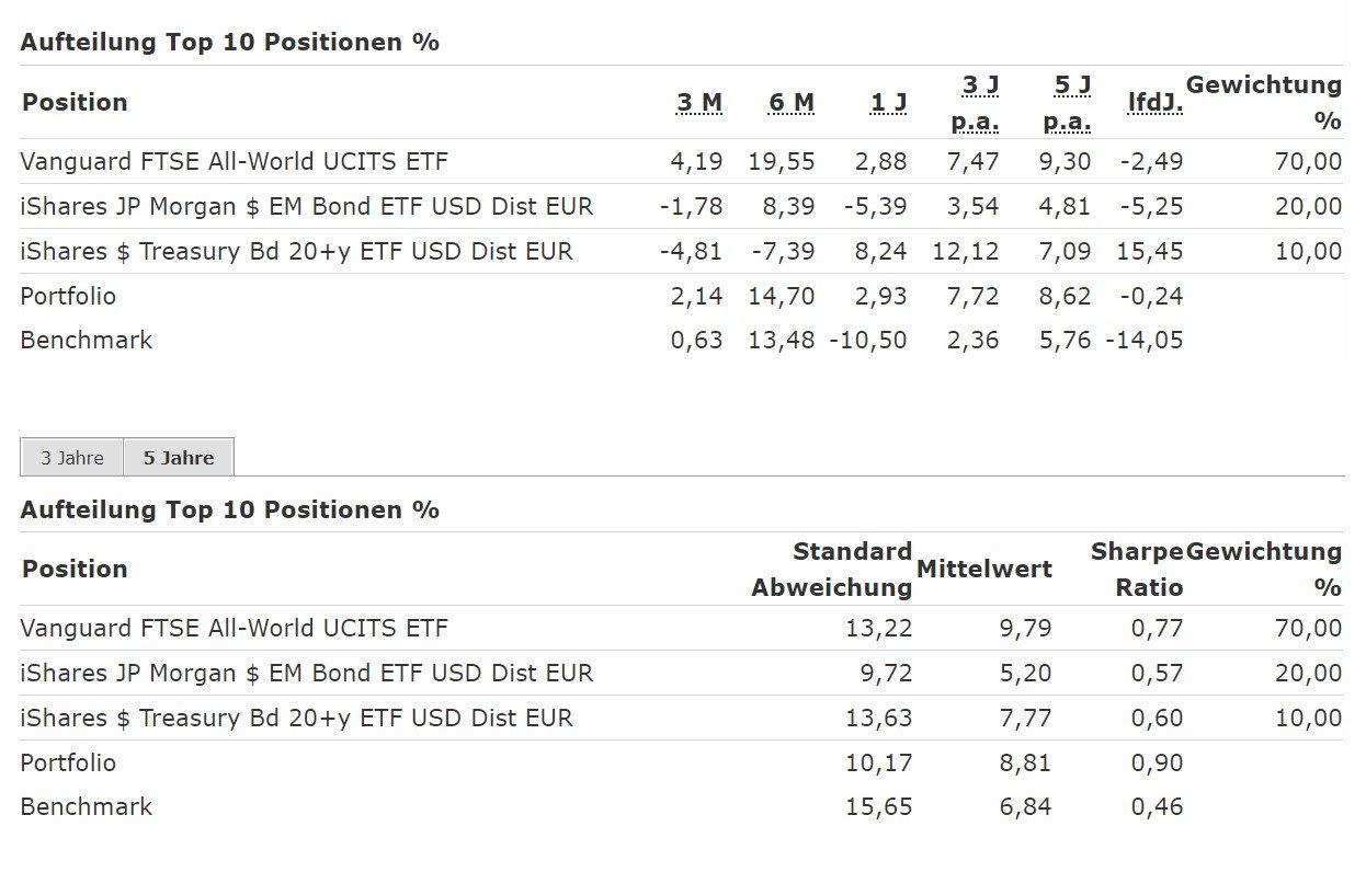 Vergleich Basisportfolio von hier (70% Vanguard All World, 20% EM Bonds, 10% US-Langläufer-Bonds) gegen nur Vanguard All World: