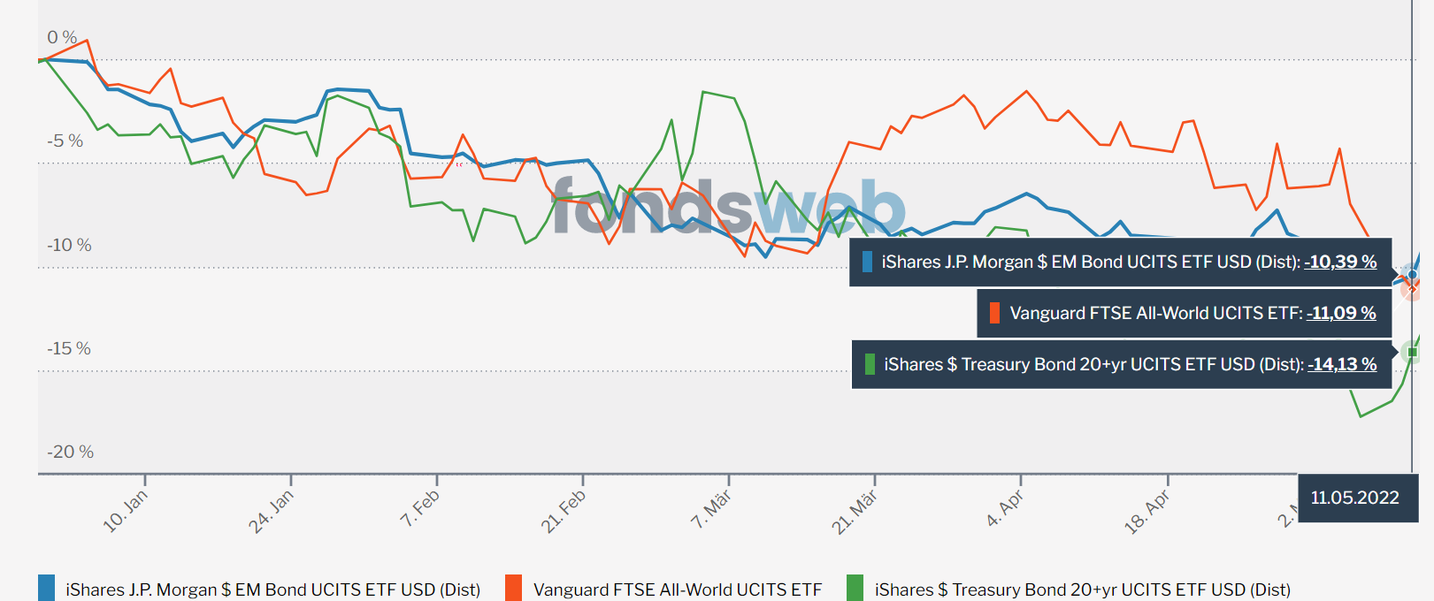 Die 10% Treasures reißen da nicht viel heraus u. die EM-Bonds sind eh völlig unberechenbar und können, wenn es dumm läuft, sogar zusammen mit den Aktien einbrechen.