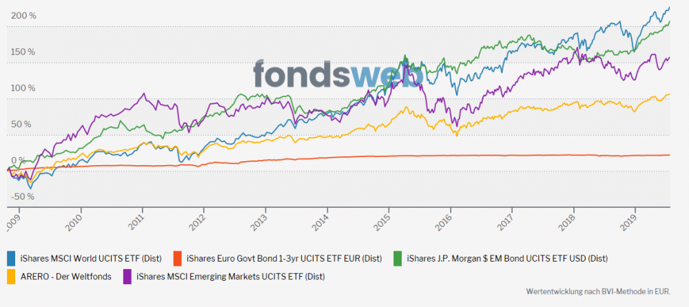 Der ETF Staatsanleihen / Unternehmensanleihen Weltweit Investment Grade $ dürfte in dem Zeitraum ungefähr zwischen ARERO und dem RK1 ETF gelegen haben.