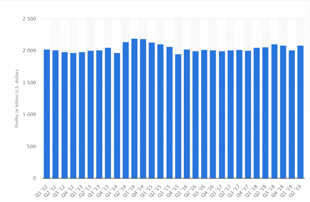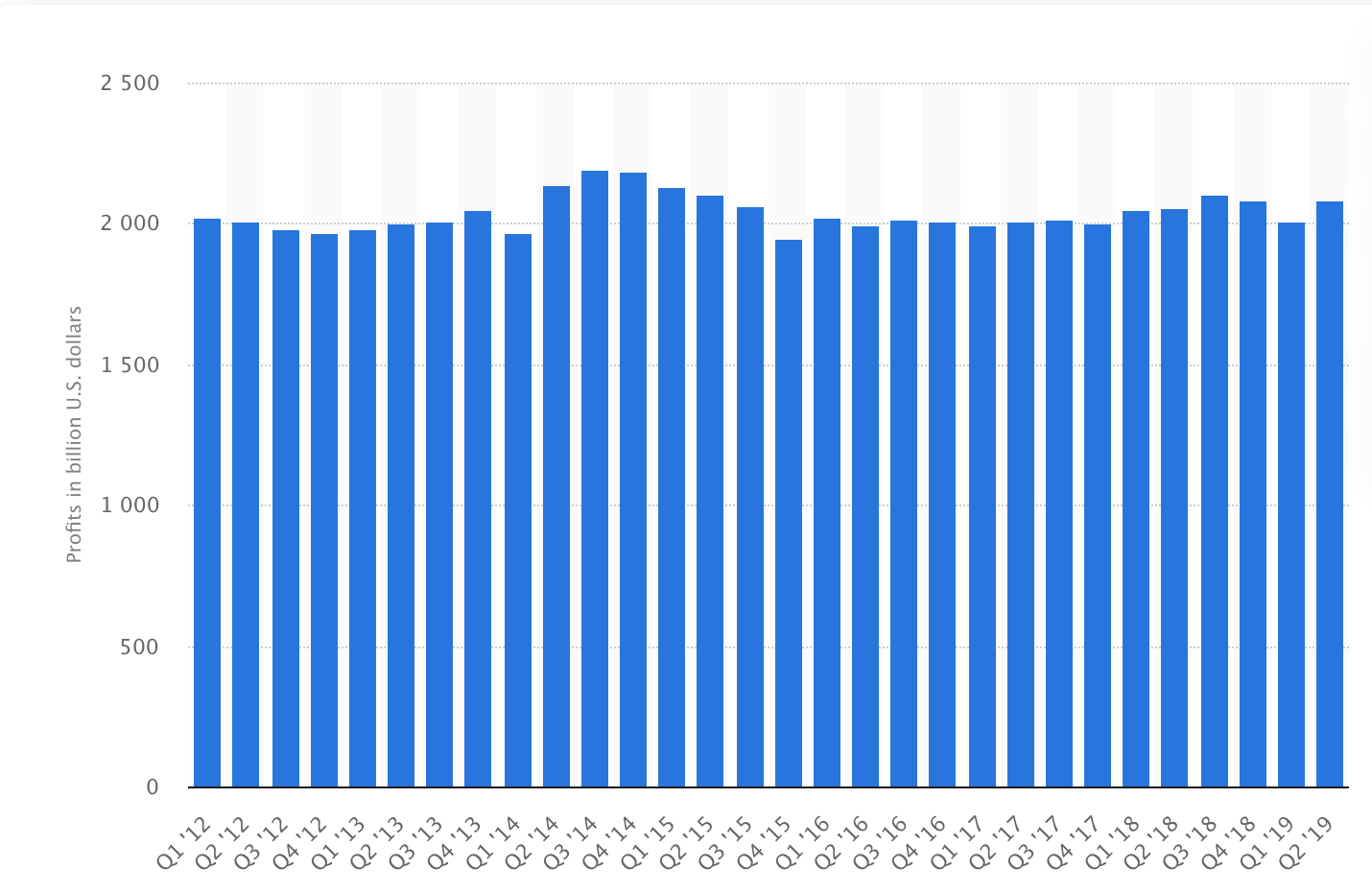 Corporate profits in the United States from 2012 to 2019, by quarter (in billion U.S. dollars)