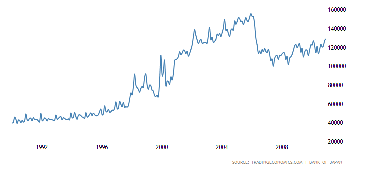 Die Bilanzsumme der Japaner von 1990 bis Ende 2010 (dürfte in JPY (mit irgendeiner Zehnerpotenz sein)):