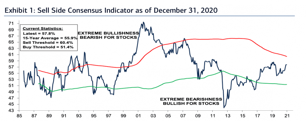 In a Monday note, Bank of America analysts led by Savita Subramanian said the firm's sell-side indicator, a measure of Wall Street's stock-market bullishness, rose by nearly one percentage point in January to 58.4%, bringing the figure less than two percentage points away from indicating a "sell" rating for U.S. stocks.