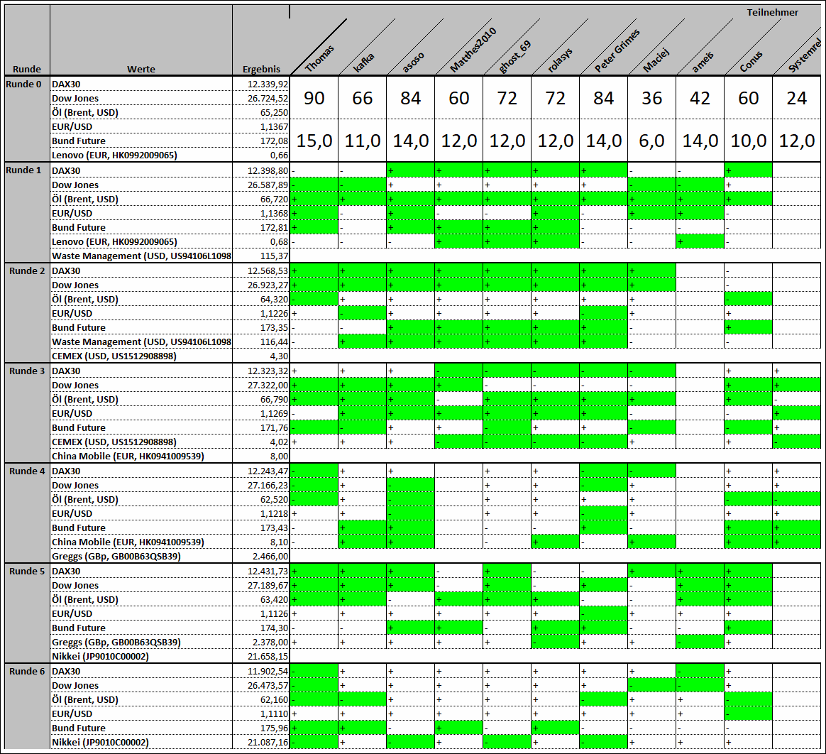 ghost_69 August 2, 2019 Hallo zusammen, eine weitere Börsenwettrunde beginnt. Viel Spaß beim Wetten. Tippabgabe bis Montag 17:00 Uhr --> 7. Runde von 11 Runden. Neue Startwerte und Veränderung aus der letzten Runde: 1. DAX30: 11902,54 (-) 2. Dow Jones: 26473,57 (-) 3. Öl (Brent, USD): 62,16 (-) 4. EUR/USD: 1,111 (-) 5. Bund Future: 175,96 (+) 6. Nikkei (JP9010C00002): 21087,16 (-) 6. (Neu) Bitcoin (USD): 10460,045 Informationen: Erst Tippabgabe! Danach können weitere Beiträge verfasst werden. Anders herum wird disqualifiziert! Die ersten 5 Werte stehen während der ganzen Tippsaison fest. Der 6. Wert wechselt von Runde zu Runde. Vorschläge für einen 6. Wert werden jederzeit entgegengenommen. Es dürfen jederzeit auch neue Spieler einsteigen und sich am laufenden Spiel beteiligen. Regeln: https://www.wertpapier-forum.de/topic/368-regeln-und-informationen-für-die-börsenwette/ Fragen: https://www.wertpapier-forum.de/topic/1420-fragen-zur-börsenwette-hier-rein/ Bitte die Tipps im vorgegebenen Format abgeben! So sieht der richtige Code als Beispiel aus: [hide ] (hier das Leerzeichen noch entfernen vor "]") 1. + 2. - 3. - 4. + 5. + 6. - [/hide] Mein Tipp: Versteckter Inhalt Du kannst den versteckten Inhalt sehen, sobald du auf dieses Thema antwortest. Ghost_69 Diesen Beitrag teilen Link zum Beitrag