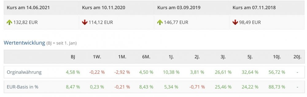FelixW Juli 10, 2021 vor 7 Stunden von Life_in_the_sun: Ich stelle mal die Performance für die USD Klasse LU0428380397 (Auflegung 2010) ein. Für einen MF Fonds sind 5,6 % pa in den letzten 10 Jahren so schlecht nicht. Es sind 4,5% p.a. Die Angabe einer Jahresrendite als 1/10 der 10 Jahresrendite (das gibst du an) ist auch was anderes als ein arithmetisches Mittel über die Rendite der 10 Jahr. Diese Form der Angabe ist schlicht unüblich und somit irreführend. Auch der Sinn einer solchen Angabe erschließt sich mir nicht - 56,72 % in 10 Jahren enthält genau die gleichen Informationen. Und letzteres ist dabei nicht irreführend. Diesen Beitrag teilen Link zum Beitrag