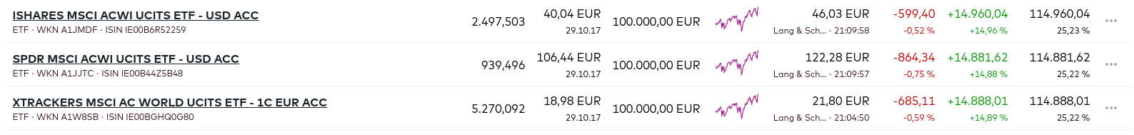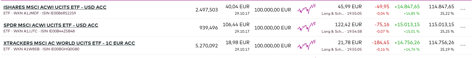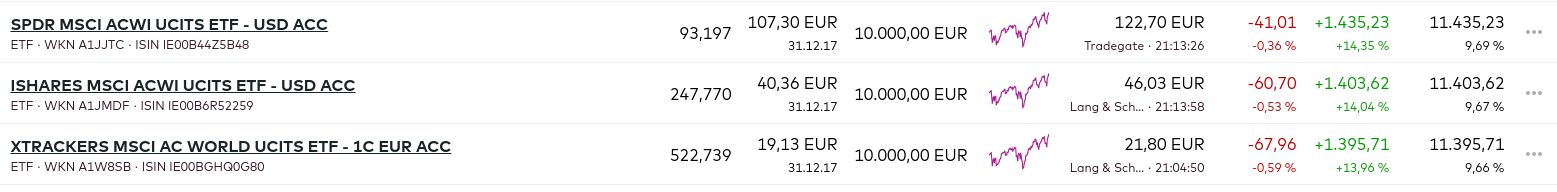 chaosmuc September 17, 2019 vor 8 Stunden von vanity: Gebühren im eigentlichen Sinn fallen nicht an, aber die umrechnende Börse wird über den Umrechnungskurs etwas vom Aufwand/Erlös für sich abzwacken. Andererseits sind die Währungsmärkte die effizientesten überhaupt, d.h. durcch Kauf von Aktien in Frankfurt und zeitgleichen Verkauf in New York wird man keinen Wechselkursgewinn erziehlen. vor 8 Stunden von vanity: Dasselbe gilt für Ausschüttungen (bei denen die Umrechnung durch die Depotbank erfolgt). Was aber bei einem MSCI-ACWI ETF irrelevant ist, alle in Deutschland für Privatanleger zugelassenen ETFs thesaurieren. Zum Thema SPDR vs X-Trackers vs iShares: Es ist ziemlich egal. Ich habe ein Onvista-Musterdepot, bei dem ich am 29.10.2017 je 100.000€ für den mir von Onvista angebotenen Kurs angelegt habe. Ergebnis: Aktuell keine 100€ Unterschied, heute tagsüber war sogar die Reihenfolge anders, (so ich mich nicht grob verschaut habe): In einem anderen Onvista-Musterdepot habe ich seit dem 31.12.2017 je 10.000€, auch da ist das Bild nicht viel anders: Hinweis: Das alles sind Vergangenheitsdaten, da alle (zumindestens als ich mich für einen entschieden habe) MSCI-ACWI-ETFs ein optimierters sampling betreiben, kann das nächstes Jahr schon ein bischen anders ausschauen. Aber optimiertes Sampling finde ich bei einem so großen Index schon ok, denn es macht wenig Sinn jede Aktie, die zu einem Bruchteil eine Promill im Index vertreten ist, zu halten. Der individuelle Einfluss von solchen Positionen auf den Index ist zu gering. Diesen Beitrag teilen Link zum Beitrag