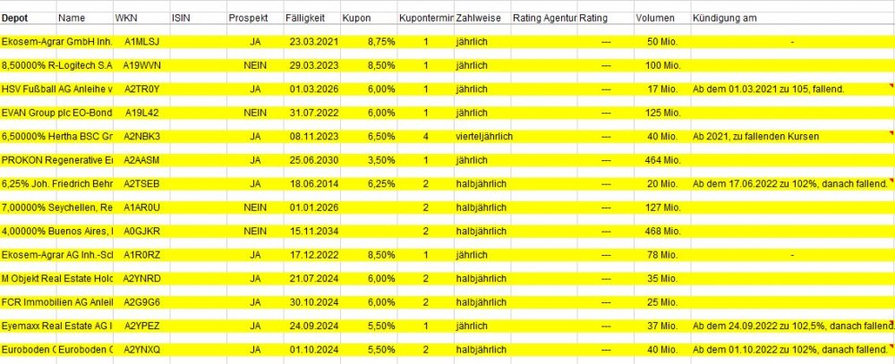 John Silver Januar 1, 2021 · bearbeitet Januar 2, 2021 von John Silver Mein aktueller Depotbestand an Obligationen, Stand 31.12.2020 (Wie immer "doppelt", einmal für die bessere Lesbarkeit und einmal zum Kopieren der WKN etc.) 4,00000% PCC SE 19(20/25) WKN A2YN1K 6,00% Diok RealEstate AG WKN A2NBY2 7,50 % PREOS Real Estate AG Wandelschuldv.v.19(24) WKN A254NA Mogo Finance S.A. EO-Bonds 2018(18/22) WKN A191NY EVAN Group plc EO-Bonds 2017(19/22) WKN A19L42 6,50000% Hertha BSC GmbH & Co. KGaA WKN A2NBK3 PROKON Regenerative Enrgn eG Anleihe v.16(18/17-30) WKN A2AASM 7,50 % PREOS Real Estate AG Wandelschuldv.v.19(24) WKN A254NA Ekosem-Agrar AG Inh.-Schv. v.2012(2020/2022) WKN A1R0RZ M Objekt Real Estate Holding Anleihe v.2019(2022/2024) WKN A2YNRD FCR Immobilien AG Anleihe v. 2019(2024) WKN A2G9G6 Eyemaxx Real Estate AG Inh.-Schv. v.2019(2022/2024) WKN A2YPEZ Euroboden GmbH Inh.-Schv. v.2019(2022/2024) WKN A2YNXQ Jung,DMS & Cie Pool GmbH Anleihe v.2019(2022/2024) WKN A2YN1M Schlote Holding GmbH Anleihe v.2019(2022/2024) WKN A2YN25 DEAG Deutsche Entertainment AG Anleihe v.2018(2021/2023) WKN A2NBF2 ERWE Immobilien AG Anleihe v.2019(2021/2023) WKN A255D0 Fürstenberg Capital II GmbH Subord.-Notes v.05(11/unb.) WKN A0EUBN 4,25000% Schalke 04 Anleihe v.2016 (2020/2021) WKN A2AA03 8,50000% R-Logitech S.A.M. A2RW77 EO-Anl. 2019(21/23) Tr.2 WKN A19WVN FF Group Fin. Luxembourg II SA SF-Anl. 2017(21)WKN A19QSV KTG Energie-Anleihe: 7,250% bis 28.09.2018WKN A2YN1M 8,00000% Hybrid Capital Funding I L.P. WKN A0D1KQ CA Electricidad d.Caracas S.-S DL-Bonds 2008(08/18) Reg.S WKN A0TULU Venezuela, Boliv. Republik DL-Bonds 1998(18) WKN 249380 Venezuela, Boliv. Republik DL-Notes 2005(25) WKN A0D1YH 6,5% Solar Millennium AG Teil-Schv. (2015) WKN A1C94H Diesen Beitrag teilen Link zum Beitrag