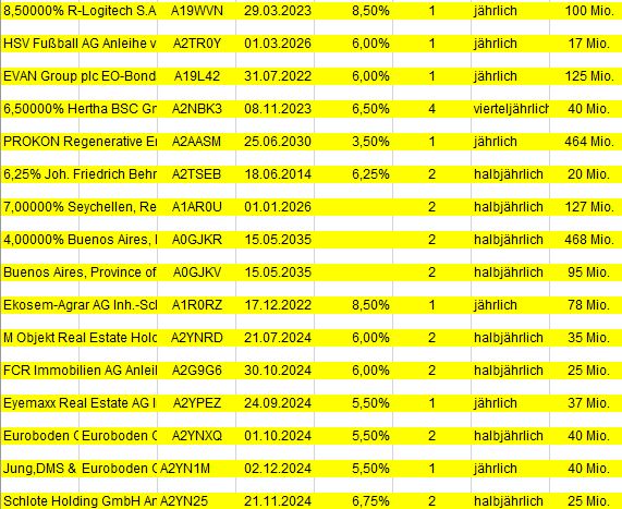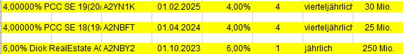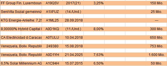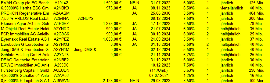 John Silver Oktober 3, 2019 · bearbeitet November 6, 2019 von John Silver Mein aktueller Depotbestand an Obligationen, Stand 06.11.2019. Aktuell manuell ergänzt: 09.10.2019 Buenos Aires, Province of... EO-Bonds 2005(17-20) Reg.S WKN A0GJKV, Fälligkeit 01.05.2020, Teiltilgung am 01.11.2019 23.10.2019 PCC SE Inh.-Teilschuldv. v.19(20/25), WKN A2YN1K, Fälligkeit 01.02.2025 06.11.2019 Fürstenberg II WKN A0EUBN PCC SE Inh.-Teilschuldv. v.19(20/25), WKN A2YN1K, Fälligkeit 01.02.2025 PCC SE Inh.-Teilschuldv. v.19(20/25), WKN A2YN1K, Fälligkeit 01.02.2025 Depot Buenos Aires, Province of... EO-Bonds 2005(17-20) Reg.S WKN A0GJKV, Fälligkeit 01.05.2020, Teiltilgung am 01.11.2019 Fürstenberg II WKN A0EUBN Kleinere Schnellübersicht, unsortiert. 4,00000% PCC SE 18(19/24) A2NBFT PCC SE Inh.-Teilschuldv. v.19(20/25), WKN A2YN1K 6,00% Diok RealEstate AG A2NBY2 Mogo Finance S.A. EO-Bonds 2018(18/22) A191NY publity AG Wandelschuldv. V.15(20) A169GM Ekosem-Agrar GmbH Inh.-Schv. v.2012(2019/2021) A1MLSJ 8,50000% R-Logitech S.A.M. A2RW77 EO-Anl. 2019(21/23) Tr.2 A19WVN HSV Fußball AG Anleihe v.2019 (21/21-26) A2TR0Y EVAN Group plc EO-Bonds 2017(19/22) A19L42 6,50000% Hertha BSC GmbH & Co. KGaA A2NBK3 Inh.Schv. v.18(21/23) A2NBK3 PROKON Regenerative Enrgn eG Anleihe v.16(18/17-30) A2AASM 6,25% Joh. Friedrich Behrens AG Anleihe v.2019(2021/2024) A2TSEB 7,00000% Seychellen, Republik DL-Notes 2010(16-26) A1AR0U 4,00000% Buenos Aires, Province of... A0GJKR EO-Bonds 2005(20-35) Reg.S A0GJKR Buenos Aires, Province of... EO-Bonds 2005(17-20) Reg.S WKN A0GJKV Ekosem-Agrar AG Inh.-Schv. v.2012(2020/2022) A1R0RZ M Objekt Real Estate Holding Anleihe v.2019(2022/2024) A2YNRD FCR Immobilien AG Anleihe v. 2019(2024) A2G9G6 Eyemaxx Real Estate AG Inh.-Schv. v.2019(2022/2024) A2YPEZ Euroboden GmbH Inh.-Schv. v.2019(2022/2024) A2YNXQ Fürstenberg II WKN A0EUBN SeniVita Sozial gemeinnützige A1XFUZ Inhaber-Genußsch. 2014/unbeg. A1XFUZ KTG Energie-Anleihe: 7,250% bis 28.09.2018 A1ML25 8,00000% Hybrid Capital Funding I L.P. A0D1KQ DL-Trust Pref.Sec.05(11/Und.) A0D1KQ CA Electricidad d.Caracas S.-S DL-Bonds 2008(08/18) Reg.S A0TULU Venezuela, Boliv. Republik DL-Bonds 1998(18) 249380 Venezuela, Boliv. Republik DL-Notes 2005(25) A0D1YH 6,5% Solar Millennium AG Teil-Schv. (2015) A1C94H Diesen Beitrag teilen Link zum Beitrag