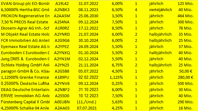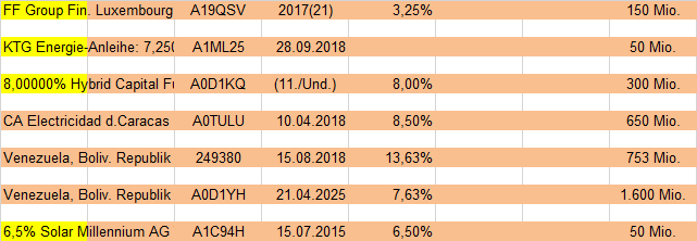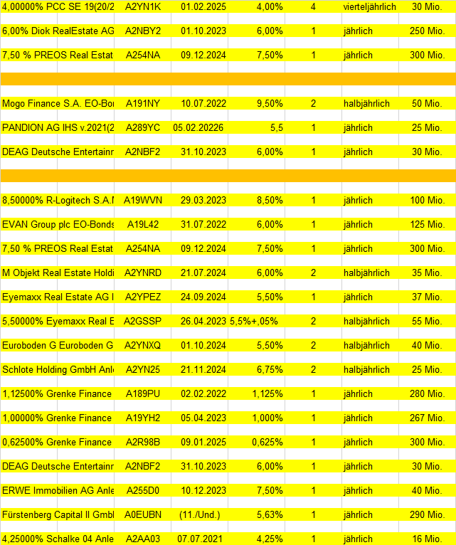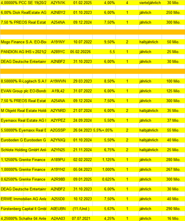 John Silver September 27, 2020 Mein aktueller Depotbestand an Obligationen, Stand 27.09.2020 (Wie immer "doppelt", einmal für die bessere Lesbarkeit und einmal zum Kopieren der WKN etc.) 4,00000% PCC SE 19(20/25) WKN A2YN1K 6,00% Diok RealEstate AG WKN A2NBY2 7,50 % PREOS Real Estate AG Wandelschuldv.v.19(24) WKN A254NA Mogo Finance S.A. EO-Bonds 2018(18/22) WKN A191NY 4,00000% PCC SE 19(20/25) WKN A2YN1K EVAN Group plc EO-Bonds 2017(19/22) WKN A19L42 6,50000% Hertha BSC GmbH & Co. KGaA WKN A2NBK3 PROKON Regenerative Enrgn eG Anleihe v.16(18/17-30) WKN A2AASM 7,50 % PREOS Real Estate AG Wandelschuldv.v.19(24) WKN A254NA Ekosem-Agrar AG Inh.-Schv. v.2012(2020/2022) WKN A1R0RZ M Objekt Real Estate Holding Anleihe v.2019(2022/2024) WKN A2YNRD FCR Immobilien AG Anleihe v. 2019(2024) WKN A2G9G6 Eyemaxx Real Estate AG Inh.-Schv. v.2019(2022/2024) WKN A2YPEZ Euroboden GmbH Inh.-Schv. v.2019(2022/2024) WKN A2YNXQ Jung,DMS & Cie Pool GmbH Anleihe v.2019(2022/2024) WKN A2YN1M Schlote Holding GmbH Anleihe v.2019(2022/2024) WKN A2YN25 paragon GmbH & Co. KGaA Inh.-Schuldv.v.2017(2020/2022) WKN A2GSB8 1,12500% Grenke Finance PLC WKN A189PU EO-Medium-Term Notes 2016(22)A189PU 0,25000% Deutsche Lufthansa AG MTN v.2019(2024) WKN A2YNV6 DEAG Deutsche Entertainment AG Anleihe v.2018(2021/2023) WKN A2NBF2 ERWE Immobilien AG Anleihe v.2019(2021/2023) WKN A255D0 Fürstenberg Capital II GmbH Subord.-Notes v.05(11/unb.) WKN A0EUBN 4,25000% Schalke 04 Anleihe v.2016 (2020/2021) WKN A2AA03 FF Group Fin. Luxembourg II SA SF-Anl. 2017(21)WKN A19QSV SeniVita Sozial gemeinnützige WKN A1XFUZ KTG Energie-Anleihe: 7,250% bis 28.09.2018WKN A2YN1M 8,00000% Hybrid Capital Funding I L.P. WKN A0D1KQ CA Electricidad d.Caracas S.-S DL-Bonds 2008(08/18) Reg.S WKN A0TULU Venezuela, Boliv. Republik DL-Bonds 1998(18) WKN 249380 Venezuela, Boliv. Republik DL-Notes 2005(25) WKN A0D1YH 6,5% Solar Millennium AG Teil-Schv. (2015) WKN A1C94H Diesen Beitrag teilen Link zum Beitrag