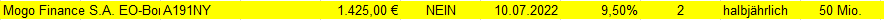 John Silver Mai 8, 2021 VERKAUF gestern (07.06.2021) Mogo Finance S.A. EO-Bonds 2018(18/22) WKN: A191NY ISIN: XS1831877755 in Frankfurt zu 100,12. Grund: Lombardabbau. Es hat die Mogo getroffen, weil die nach langer Zeit mal wieder über Pari steht. Wenn die Zinsen allgemein wieder steigen, denke ich, werden zudem Firmen wie Mogo Probleme mit der Refinanzierung bekommen. Diesen Beitrag teilen Link zum Beitrag