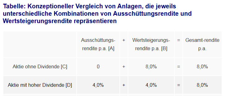Und genau das sagt das Textzitat, wenn die Summe immer 8% ist und die Ausschüttungsrendite erhöht wird, verringert sich die Wertsteigerungsrendite (Kursrendite).