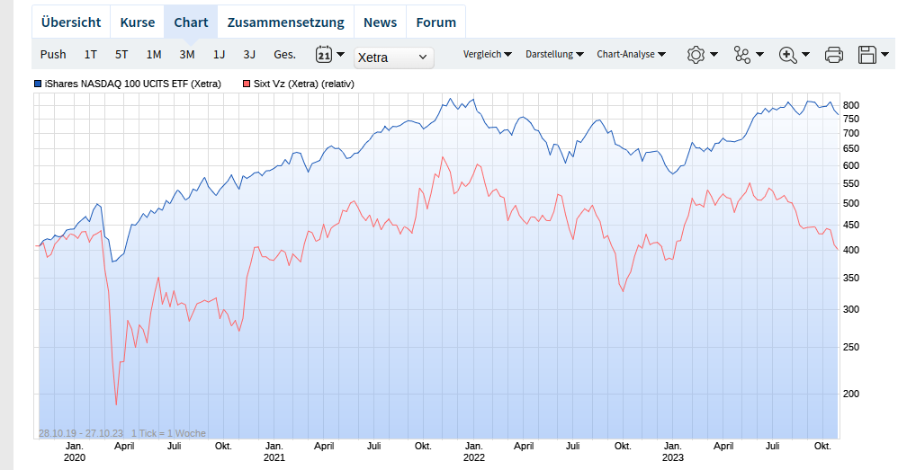 26.10.2019 bis 27.10.2023: Sixt Vz inkl. Dividenden vs. Nasdaq 100 thesaurierend: