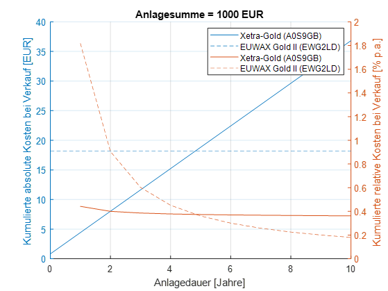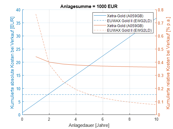 Ich nehme jetzt einfach mal an, dass die Börse Stuttgart mit dem Geldkurs von Euwax nicht viel unter den Geldkurs von Xetra gehen kann, bevor die Leute sich das Gold physisch liefern lassen. Wenn man das berücksichtigt und die Rechnung mit den obigen Zahlen wiederholt, allerdings für Euwax einfach den Xetra Geld-Kurs annimmt, dann lohnt sich Euwax nach einer Haltedauer von 5 Jahren: