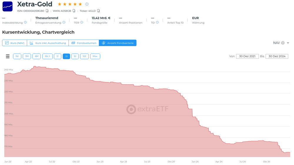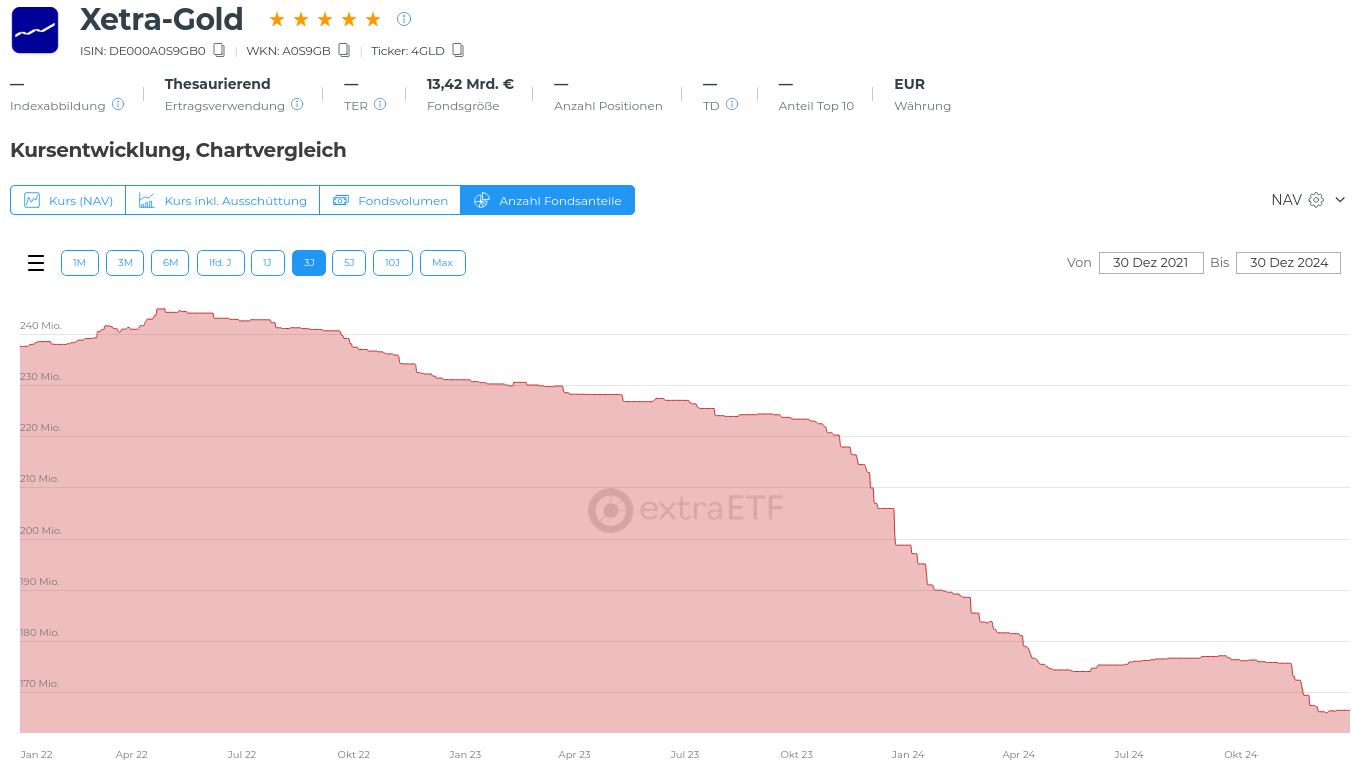 • Xetra-Gold: Wird oft von institutionellen Investoren genutzt, die auf geringe laufende Kosten achten. Diese könnten durch größere Fonds und kostengünstigere Alternativen verdrängt worden sein.
