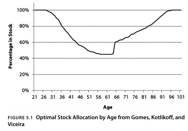 Ein Bild aus dem Buch dazu. Statt der Kappung bei 100% kann man sich genausogut auch mehr als 100% bis zu einer sinnvollen Obergrenze vorstellen. (im Buch aus dem Paper zitiert, scheint ein sehr risikoscheuer Investor zu sein mit nur gut 40% Aktien bei Renteneintritt)