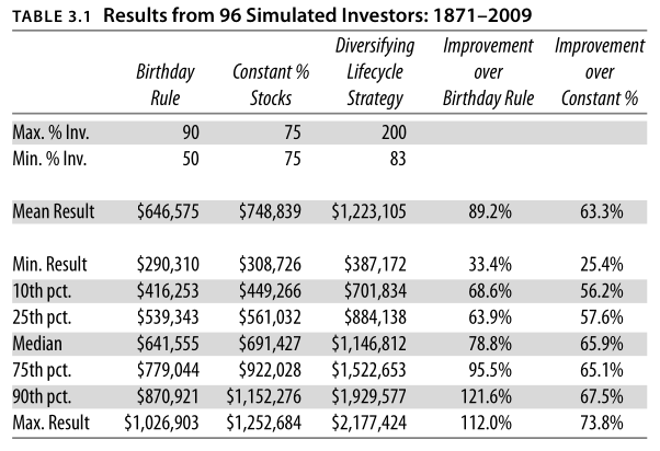 Ja, das wird verglichen (auch mit Monte-Carlo Simulationen statt nur historische Daten). Der große Unterschied ist, dass einmal die AA konstant ist (75/25) und bei Lifecycle Investing variabel. Wobei das Ergebnis hier so hingetrimmt ist, dass das „Risiko“ des Endergebnisses vergleichbar ist; die Aktienquote beim Lifecycle Investing scheint dadurch deutlich höher zu sein (finde den vergleich aber nicht ganz optimal, war aber auf anhieb zu finden beim drüberscrollen).